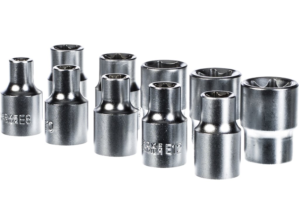 A 1/2"-os készlet tartalma: CrV acél dugókulcsok, 38 mm hosszú E8, 10, 11, 12, 14, 16, 18, 20, 22, 24.