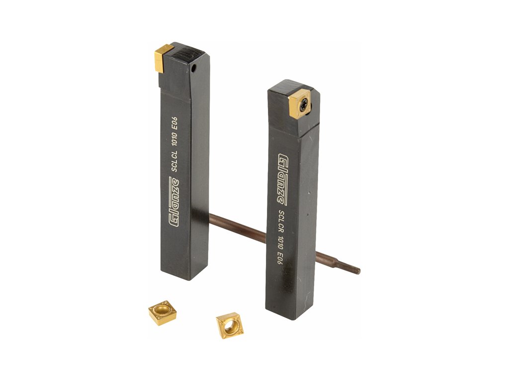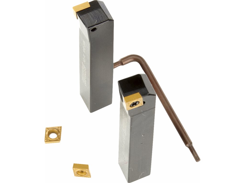 2 darabos lapkás késtartó készlet, 10 × 10 mm-es, karbid-lapkák. A készlet tartalma: 2 db késtartó, 4 db cserélhető lapka, 2 db imbuszcsavar, 1 db imbuszkulcs.