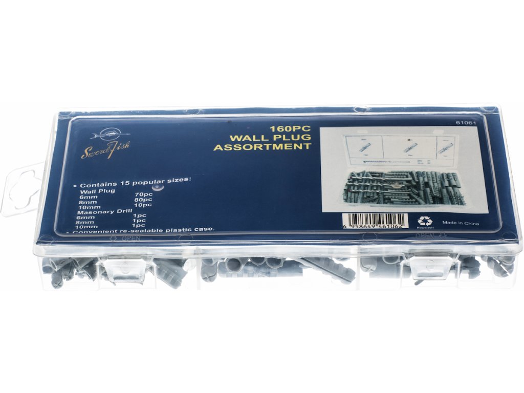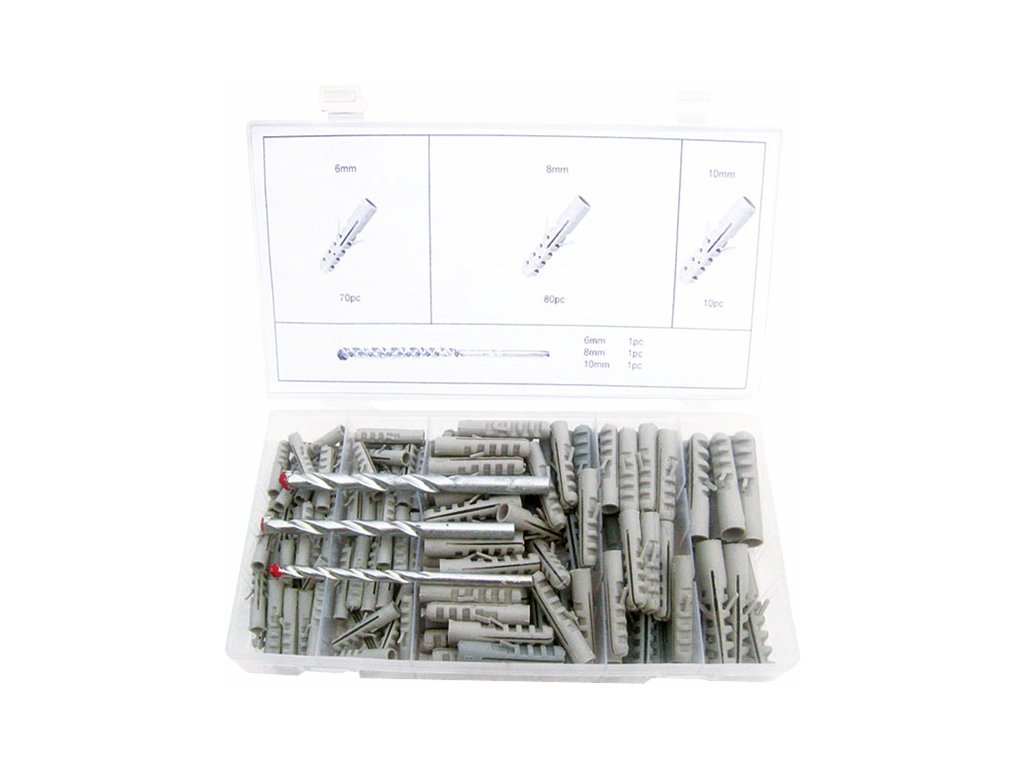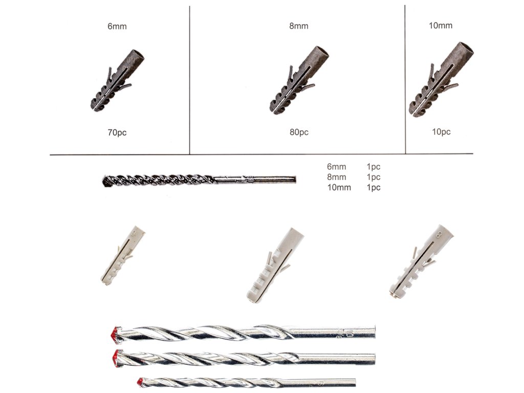 Tartalma: műanyag PE tiplik 6 mm (70 db), 8 mm (80 db), 10 mm (10 db) átmérőkkel, 3 vídia fúró 6, 8 és 10 mm átmérőkkel, fal és beton fúrásához. Műanyag dobozban.