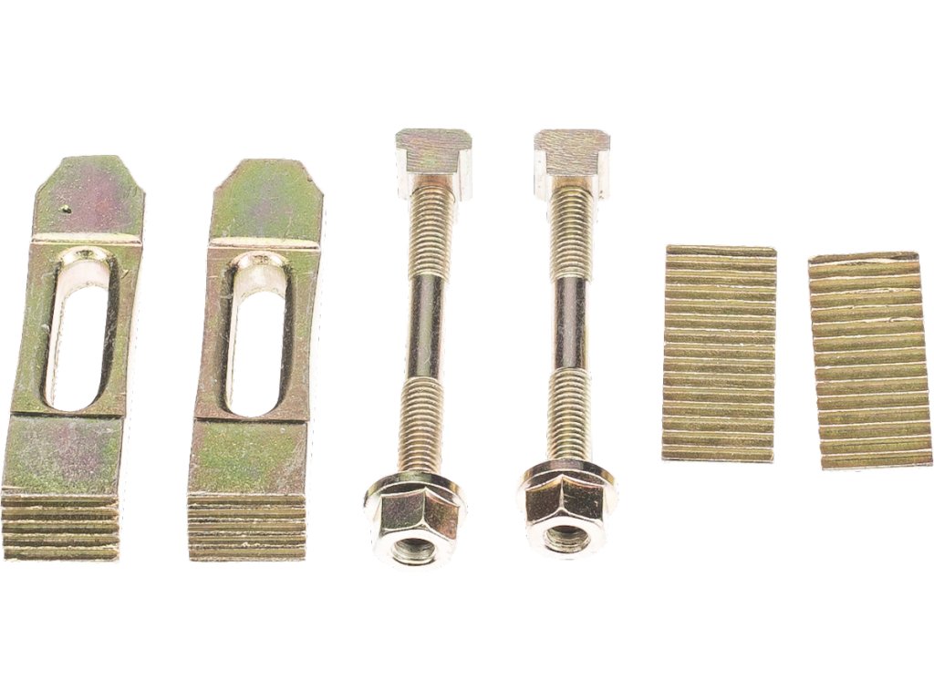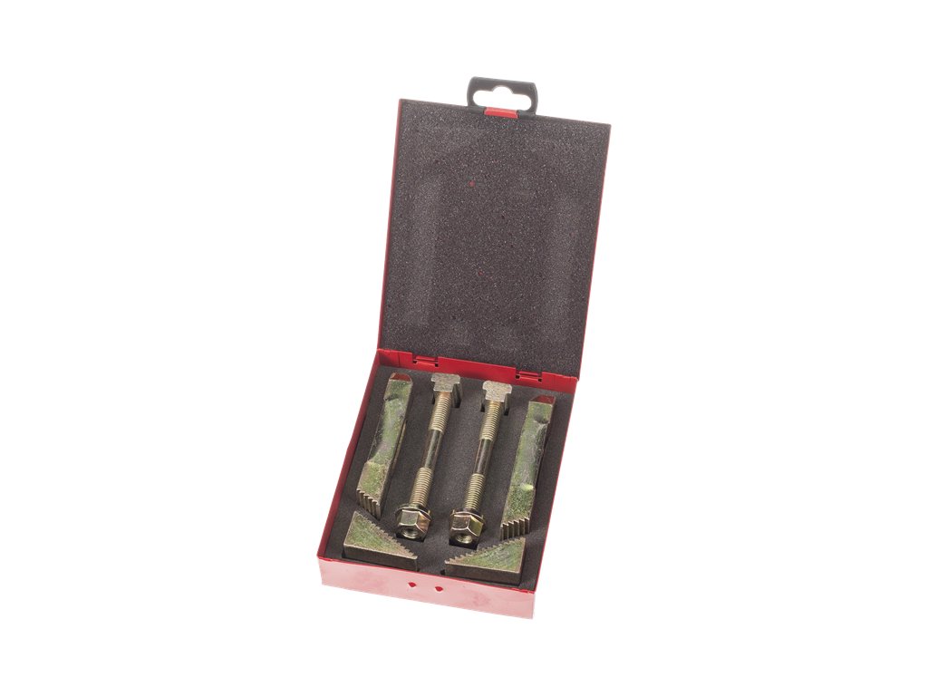 Befogó készlet a munkadarabok T-hornyú asztalra való rögzítéséhez. A készlet tartalma: 2 db magasság beállító háromszög 25 × 25 × 42 mm, 2 db befogó pofa 100 × 25 × 15 mm és 2 db szorítócsavar (M10 × 100 mm).