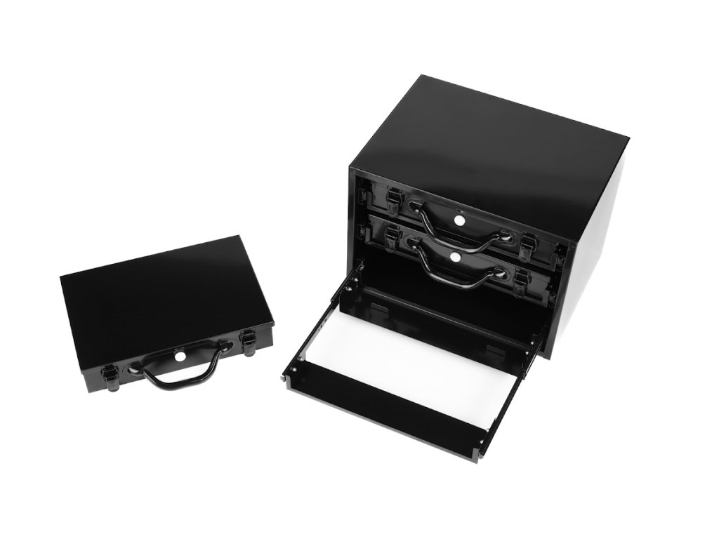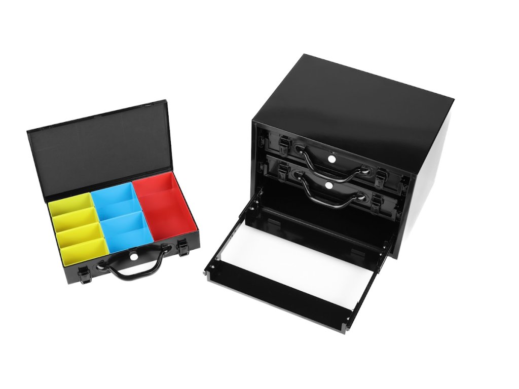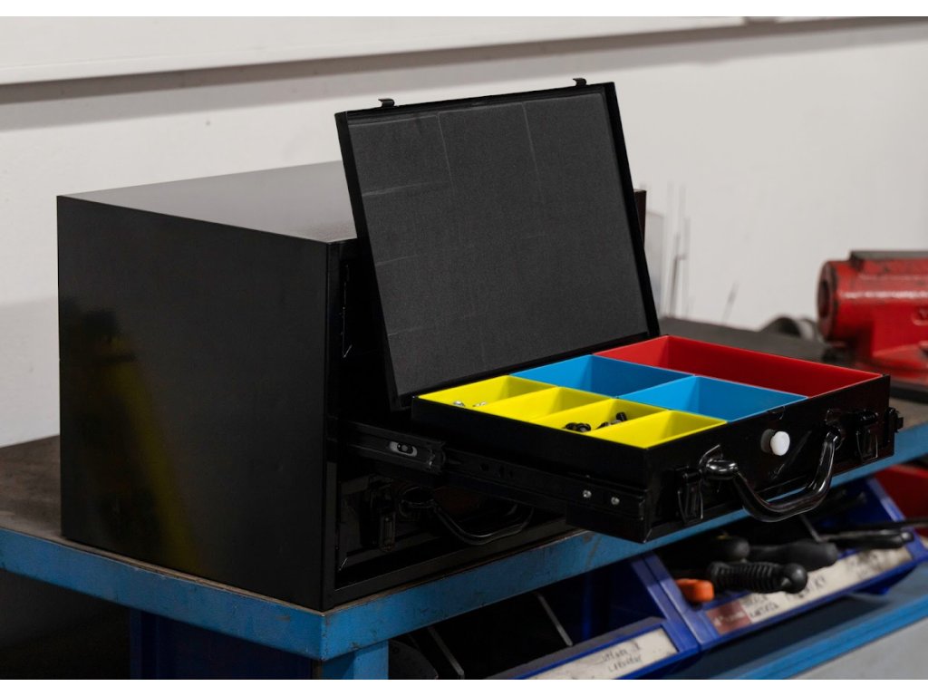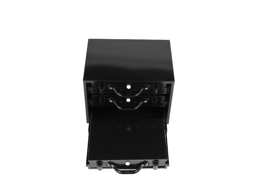 A masszív acéllemezből készült szerszámosdoboz három tágas fiókkal rendelkezik golyóscsapágyas síneken, amelyek sima és megbízható működést biztosítanak nagyobb terhelés mellett is. A fiókok zárhatók és egyben hordozhatók, így könnyen mozgatható az egész szerszám- vagy alkatrészkészlet. Minden fiók különböző méretű műanyag dobozokkal van felszerelve, amelyek segítenek a fúrók, apró alkatrészek vagy kötőelemek rendszerezésében. A doboz felülete tartós porszórt festéssel van kezelve, amely védi a karcolásokkal és korrózióval szemben.