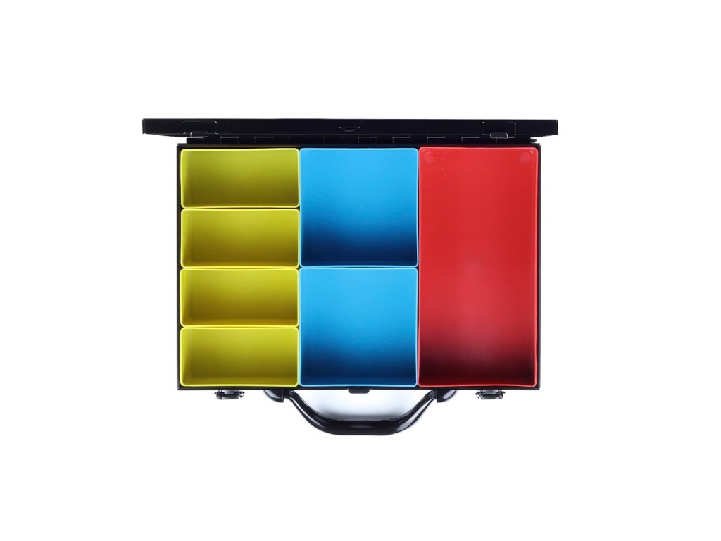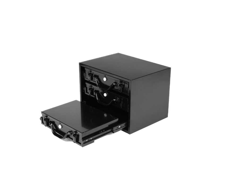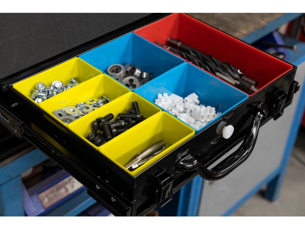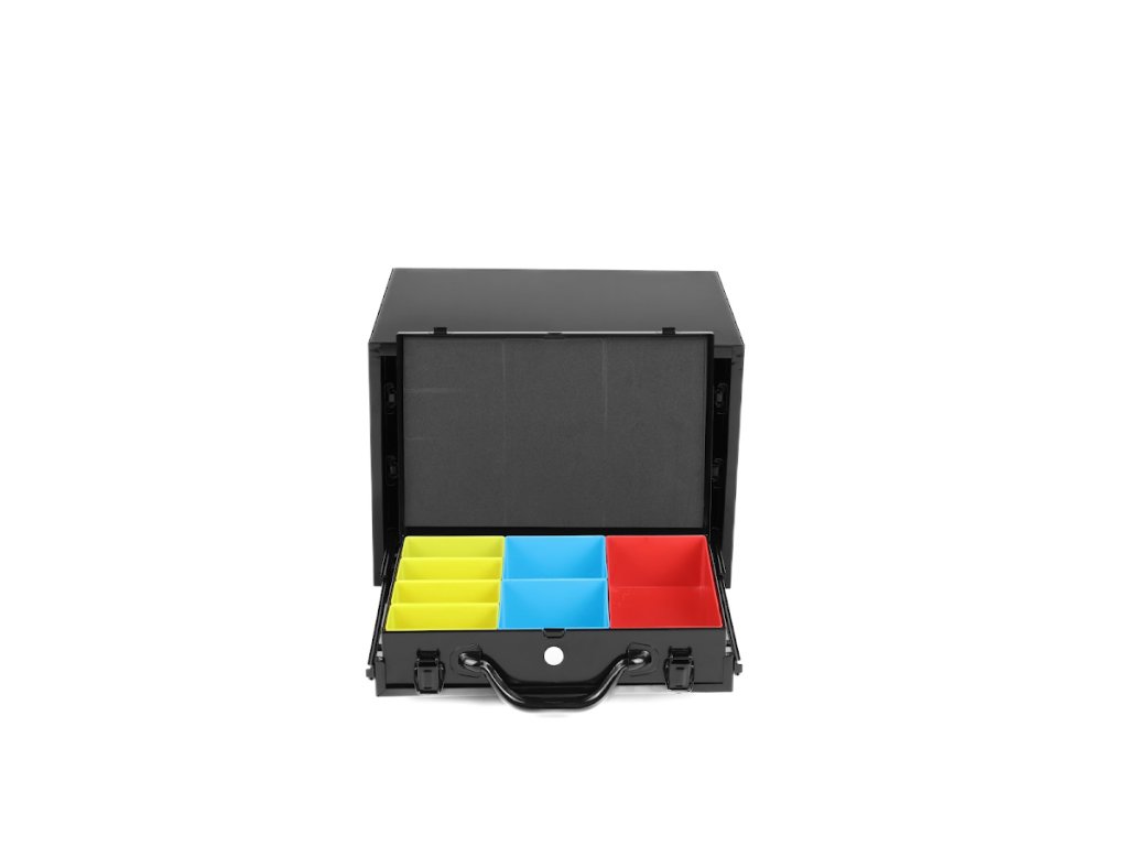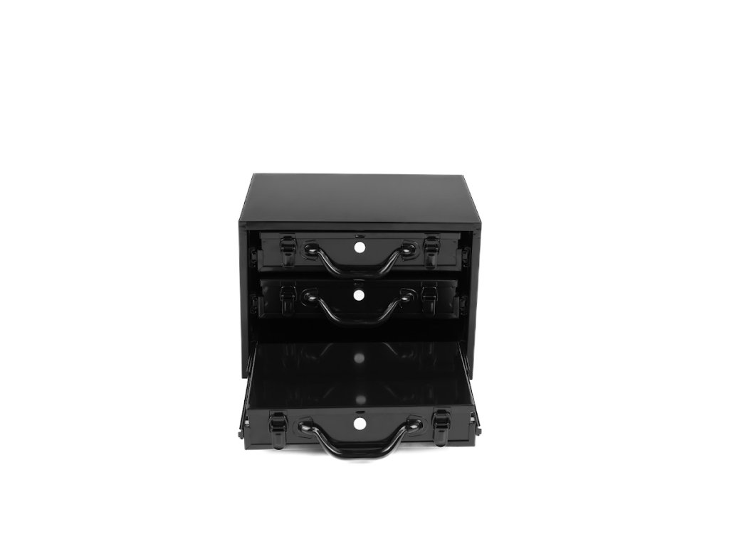 A masszív acéllemezből készült szerszámosdoboz három tágas fiókkal rendelkezik golyóscsapágyas síneken, amelyek sima és megbízható működést biztosítanak nagyobb terhelés mellett is. A fiókok zárhatók és egyben hordozhatók, így könnyen mozgatható az egész szerszám- vagy alkatrészkészlet. Minden fiók különböző méretű műanyag dobozokkal van felszerelve, amelyek segítenek a fúrók, apró alkatrészek vagy kötőelemek rendszerezésében. A doboz felülete tartós porszórt festéssel van kezelve, amely védi a karcolásokkal és korrózióval szemben.