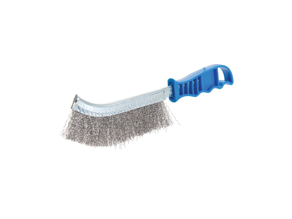 Acél huzalkefe műanyag fogantyúval, különösen alkalmas hegesztések előkészítésére és tisztítására. Hossza 240 mm.