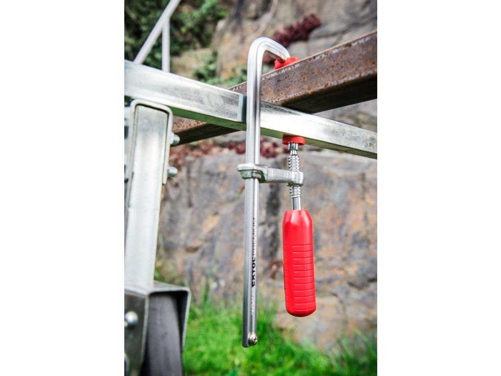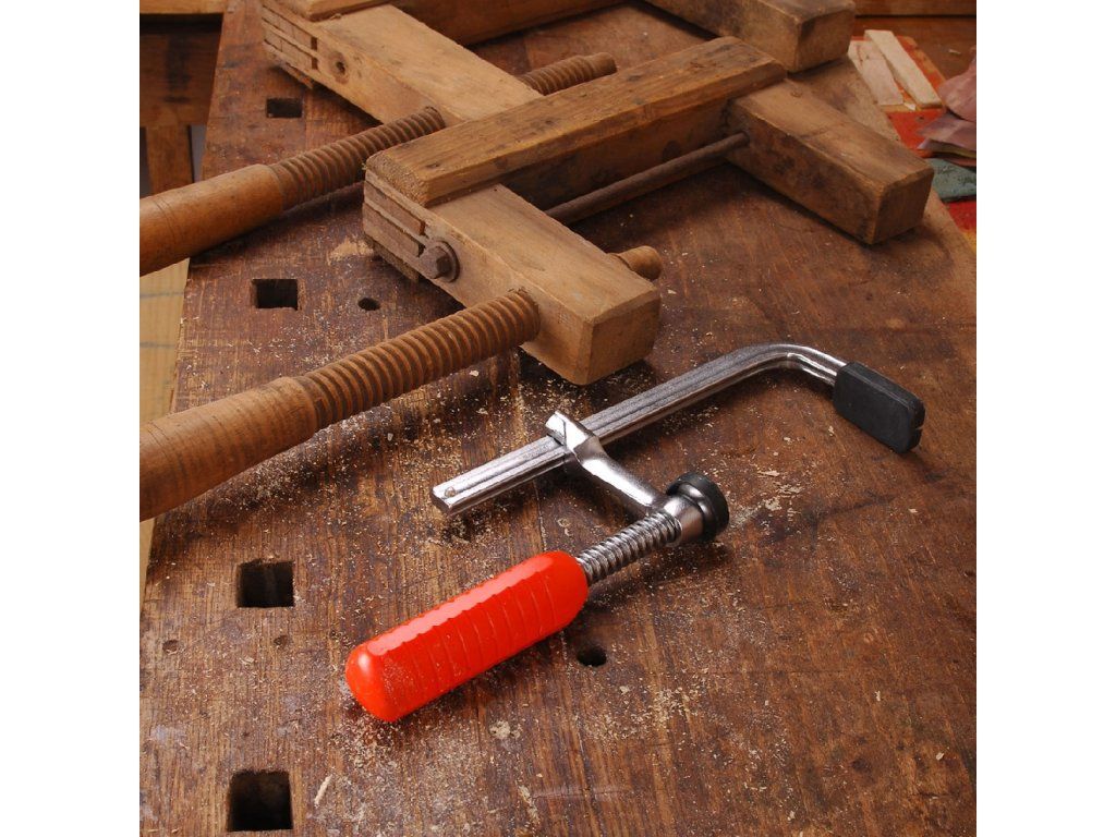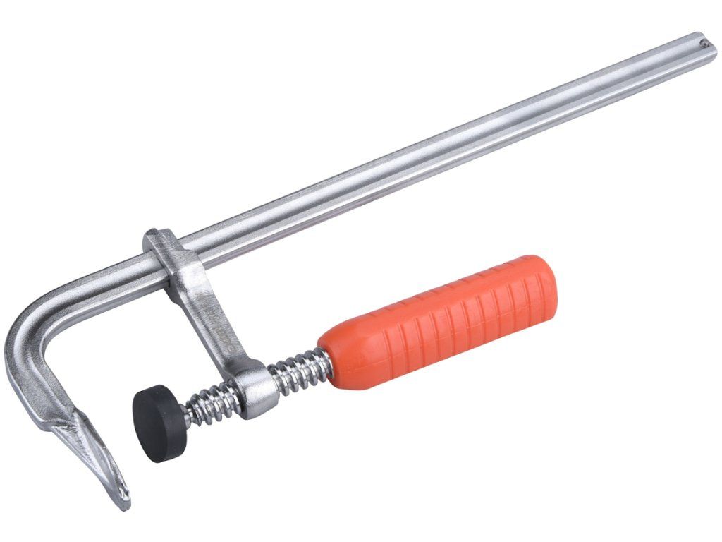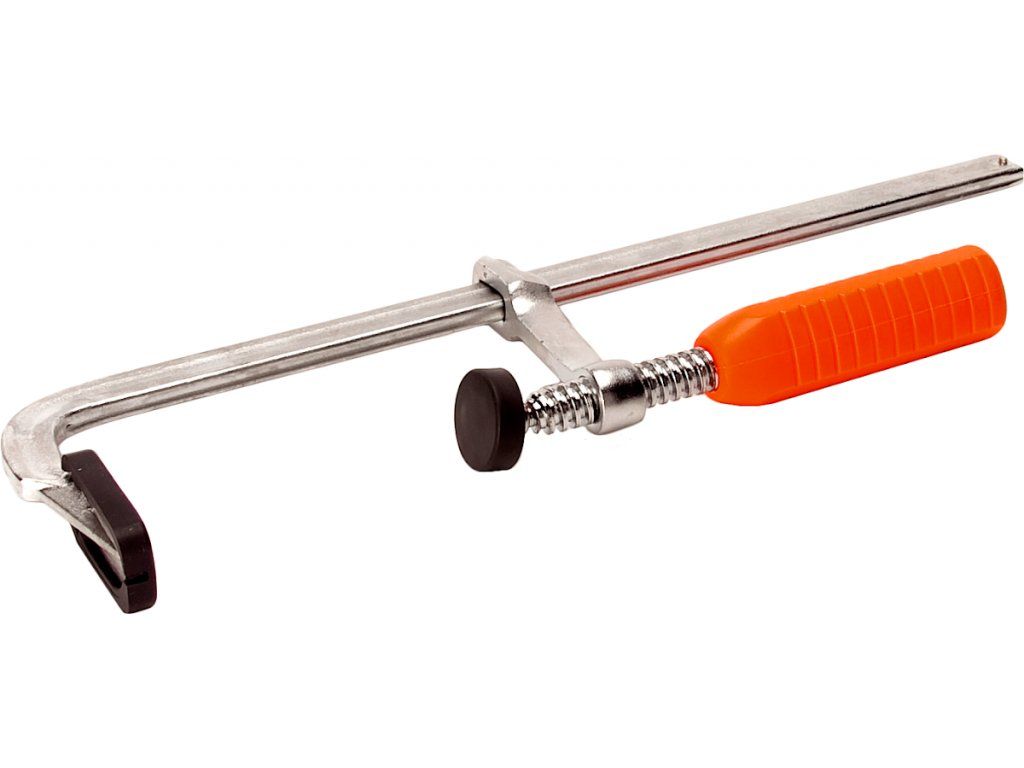 F"-típusú asztalos szorító - egy darabból álló masszív profil, a szorítópofákon műanyag védőburkolat, ergonómikus műanyag markolat."