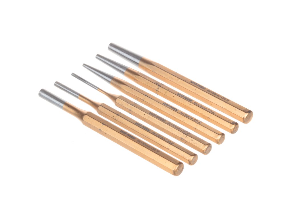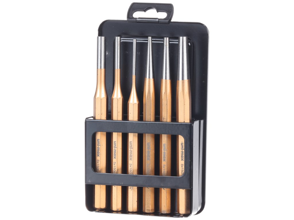 3 átütő és 3 sasszeg beütő. Az átütő méretei Ø 3; 5 és 8 × 150, sasszeg beütő Ø 3 mm 5 és 8 × 150 mm. A szerszámok CrV-ból készülnek, amivel biztosított a hosszú élettartamuk. Műanyag dobozban.