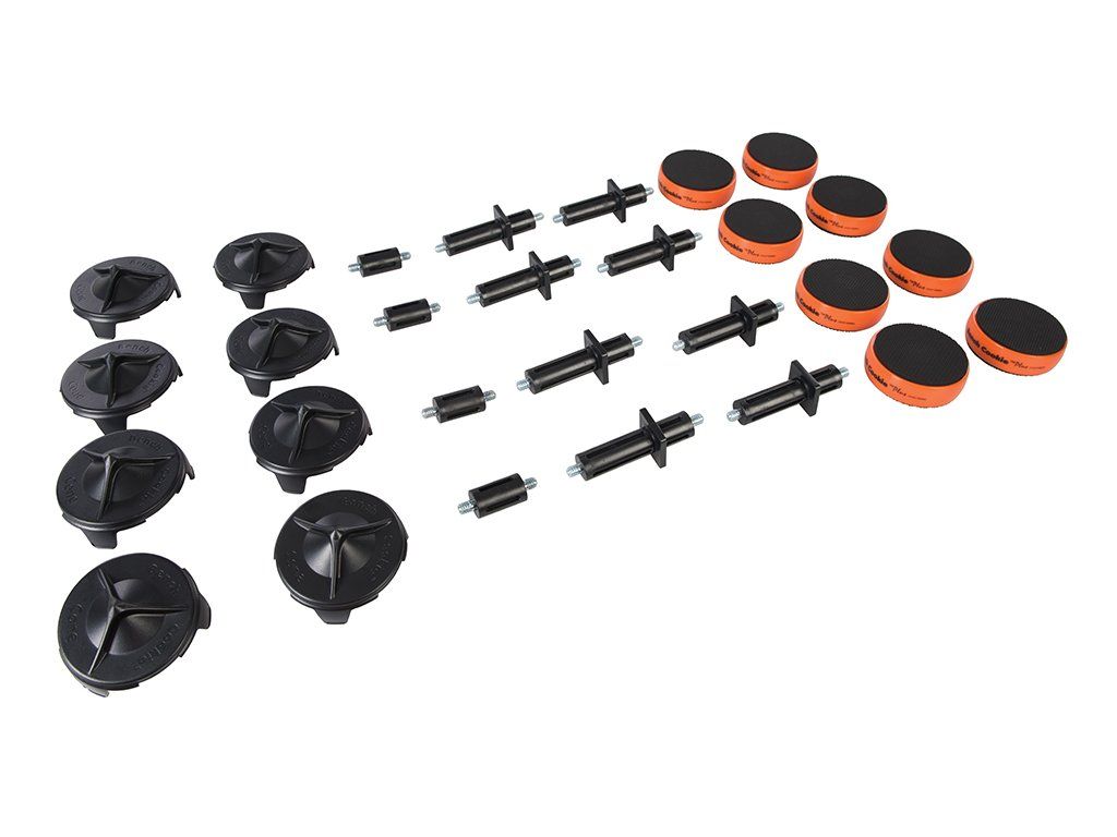 8 db csúszásgátló alátét lágyított gumifelülettel, amely szilárdan tartja a munkadarabot fűrészelés, csiszolás, marás és egyéb tevékenységek során rögzítők nélkül is.