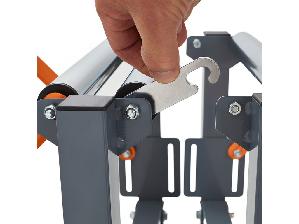 Állítható magasságú görgős pálya a BORA-tól. Hajlítható, hosszban és magasságban állítható, alakját az Ön igényeihez igazíthatja. A beépített horgoknak köszönhetően több ilyen öv összekapcsolható. A görgők a stabilitás érdekében reteszelhetők. A pálya kompakt méretekre összecsukható a jobb tárolás érdekében. A teleszkópos lábakon egy egységrendszer található a szállítószalag magasságának pontos beállításához. Maximális egyszeri teherbírás 136 kg.