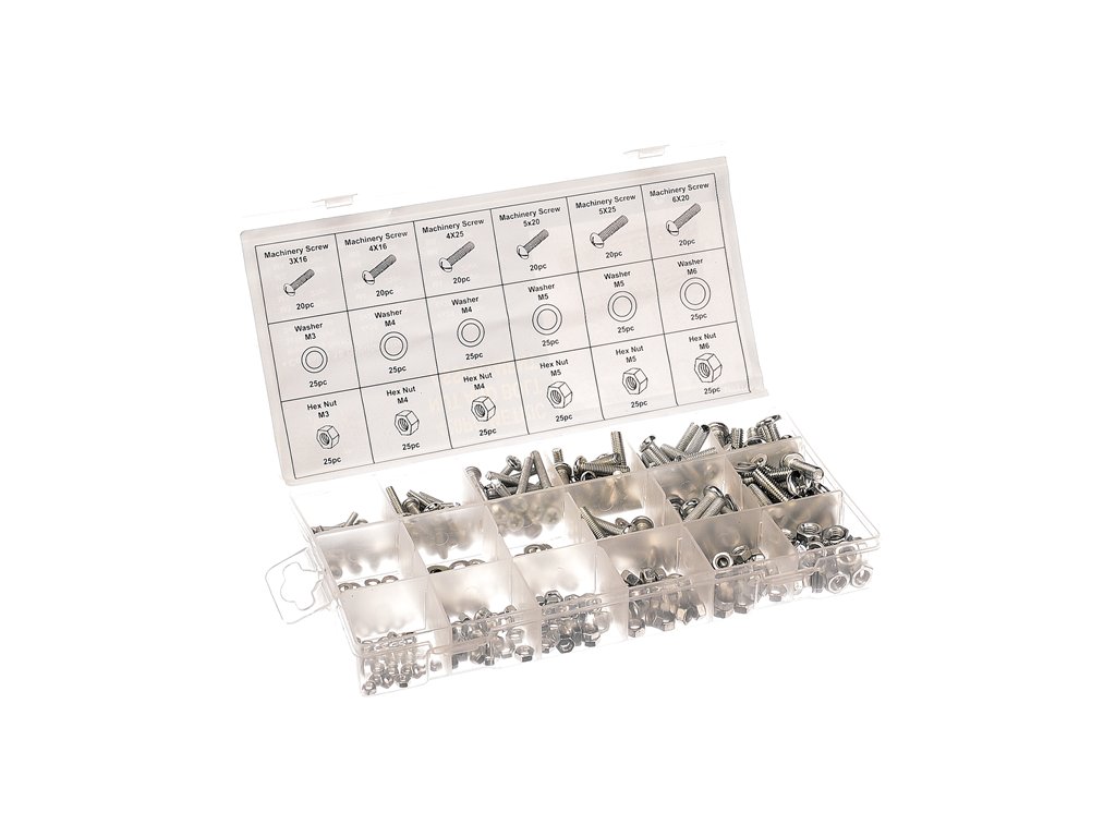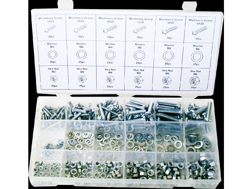 A készlet tartalma: csavarok: M3 × 16 mm – 20 db; M4 × 16 mm – 20 db; M4 × 25 mm – 20 db; M5 × 20 mm – 20 db; M5 × 25 mm – 20 db; M6 × 20 mm – 20 db. Alátétek: M3 – 25 db; M4 – 50 db; M5 – 50 db; M6 – 25 db. Anyák: M3 – 25 db; M4 – 50 db; M5 – 50 db; M6 – 25 db.