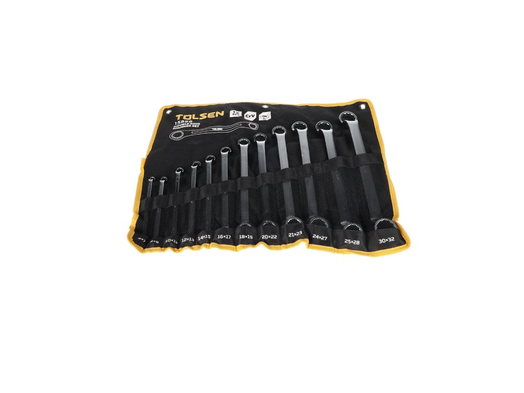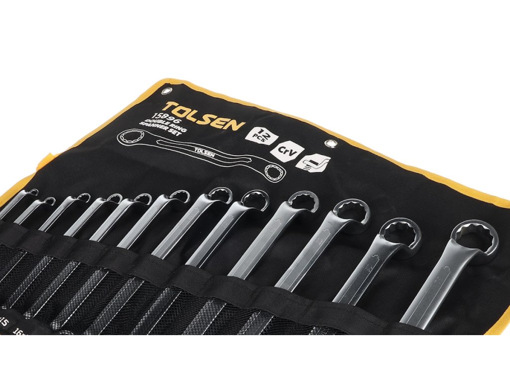 Ez a minőségi csillag-villáskulcs készlet tizenkét leggyakrabban használt méretet tartalmaz 6-tól 32 mm-ig. A kulcsok DIN 838 szabvány szerint készülnek, ami garantálja a pontos méreteket, a nagy szilárdságot és a hosszú élettartamot még intenzív használat mellett is. A krómozott, matt (szatén) felület növeli a kopás- és korrózióállóságot, valamint kényelmes fogást biztosít csúszás nélkül.