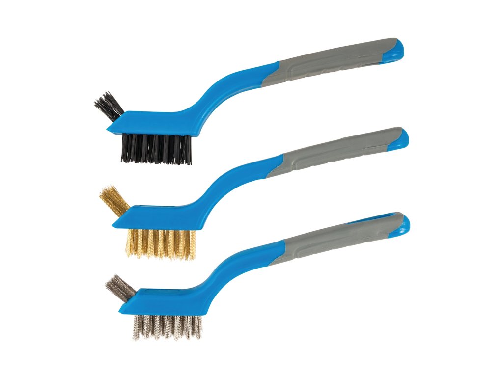 Egy sor drótkefét. Nylon, sárgaréz és rozsdamentes acél sörték, 15 mm hosszú. Teljes kefehossz 175 mm.