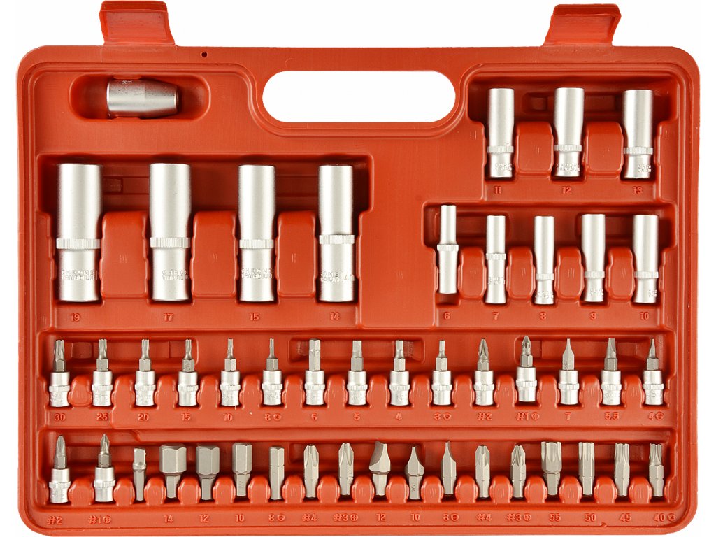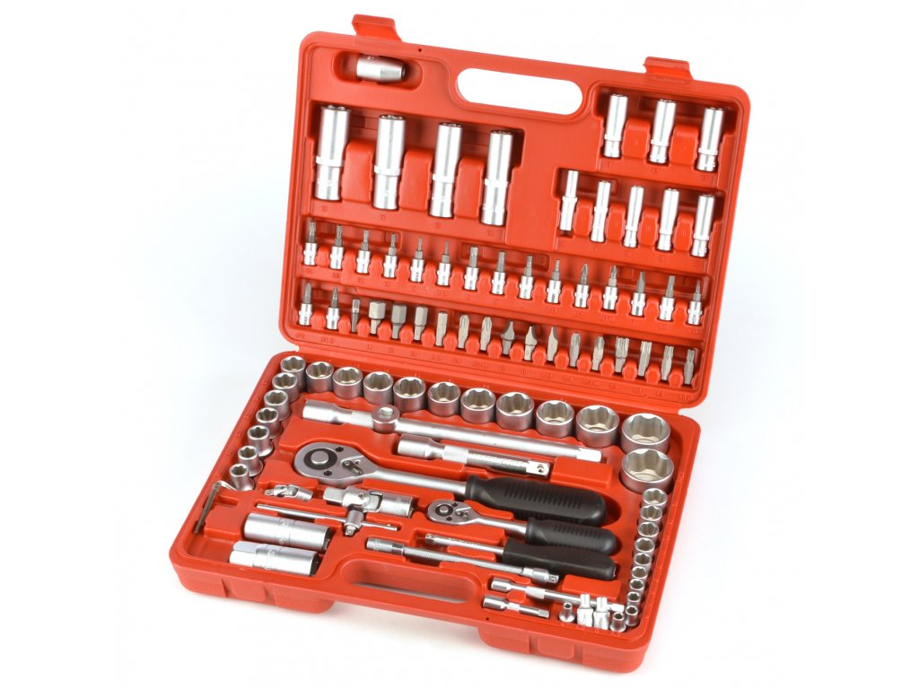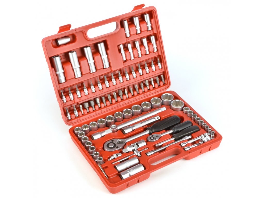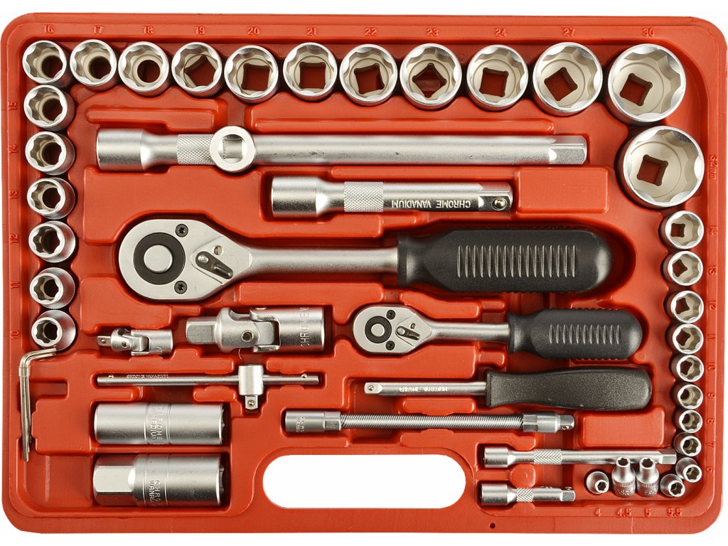 Rendkívül gazdagon felszerelt dugókulcs készlet, tartalma: 1/4"-os készlet - 13 db dugókulcs 4; 4.5; 5; 5.5; 6; 7; 8; 9; 10; 11; 12; 13; 14 mm, - 8 db hosszú dugókulcs 6; 7; 8; 9; 10; 11; 12; 13 mm, - 17 db bit (37 mm-es): HEX 3; 4; 5; 6 mm, PZ1, PZ2, PH1, PH2, T8; 10; 15; 20; 25; 30, lapos 4; 5,5; 7 mm, rugalmas hosszabbító toldat 150 mm, 2 db merev hosszabbító toldat 50 és 100 mm, racsni, dugókulcs fogantyú, csúszó T-darab és bit-adapter SQ1/4 HEX1/4. 1/2"-os készlet: - 18 db dugókulcs 10; 11; 12; 13; 14; 15; 16; 17; 18; 19; 20; 21; 22; 23; 24; 27; 30; 32 mm, - 4 db hosszú dugókulcs 14; 15; 17; 19 mm, - 15 db bit: HEX 8; 10; 12; 14 mm, PZ3, PZ4, PH3, PH4, T40; 45; 50; 55, lapos 8; 10; 12 mm, gyertyakulcs 16 és 21, hosszabbító toldat 125 és 250 mm, racsni, adapter 1 × 3/8, bit-adapter HEX5/16 és SQ1/2, csuklós csatlakozó és 3 imbusz "L" 1,5; 2; 2,5 mm. Anyag Cr-V acél, szatén felület.