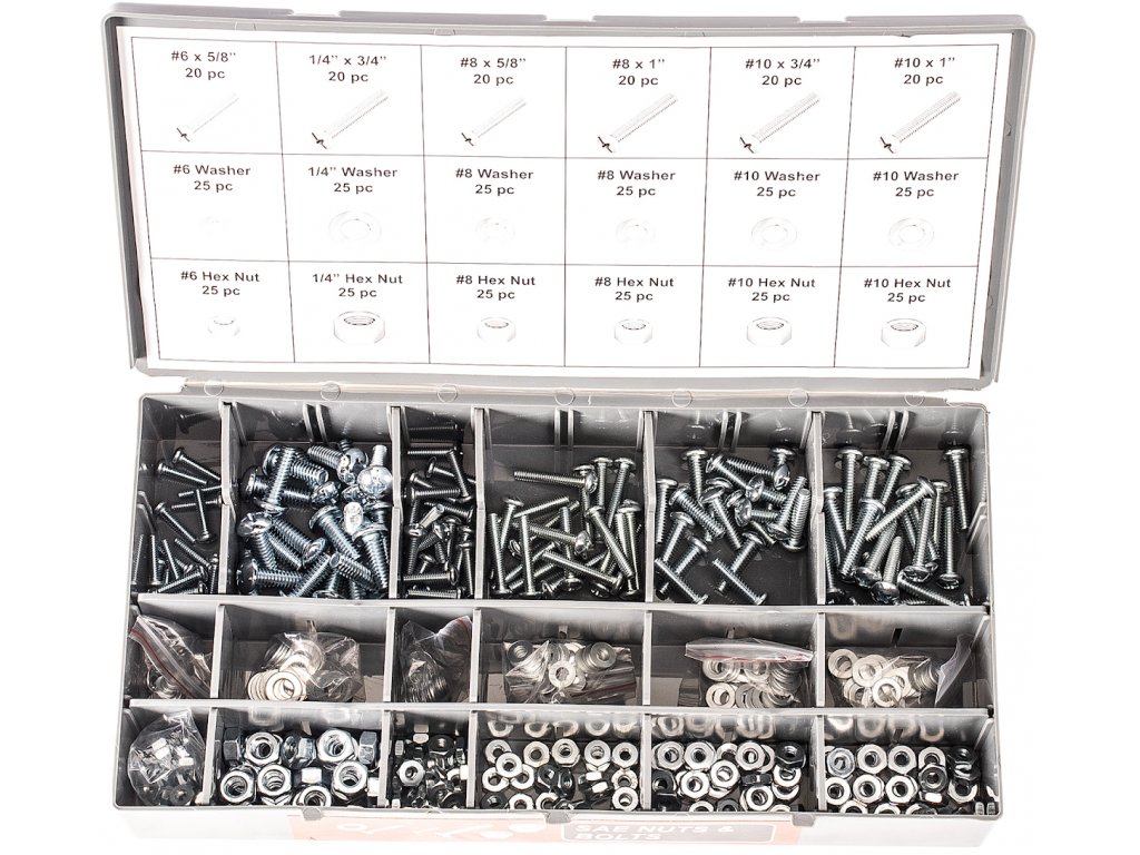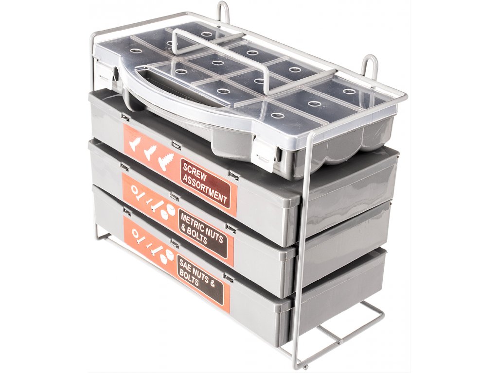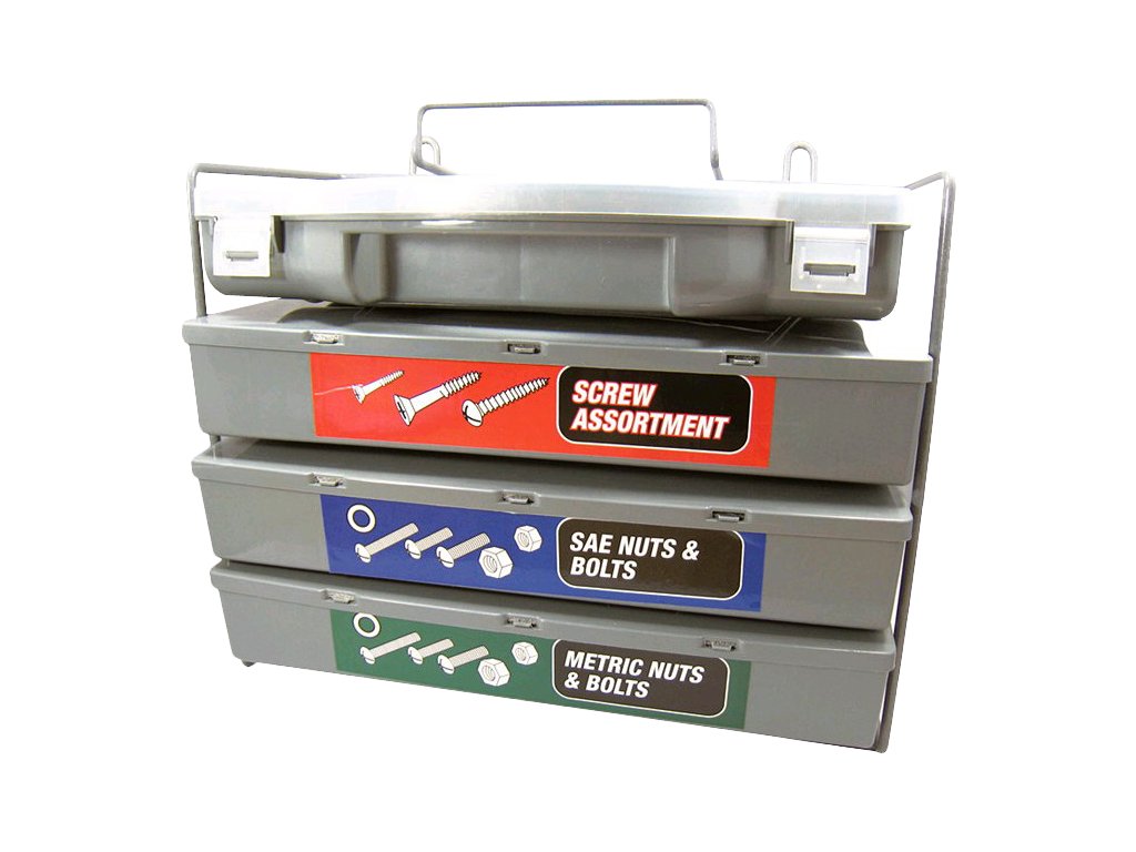 Csavar- és alátétkészlet metrikus és SAE szabvány szerint – praktikus megoldás barkácsolóknak és szakembereknek egyaránt. A készlet a leggyakrabban használt méretű csavarokat, anyákat és alátéteket tartalmazza, áttekinthetően elrendezve három fiókban és egy rendezőben. Falra akasztható vagy munkapadra helyezhető, így ideális megoldás kis műhelyek számára.