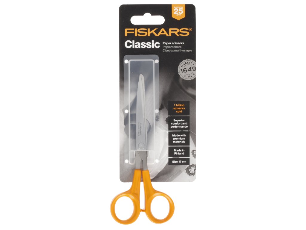 Könnyű, kompakt olló hosszú pengével a papír vágásához. Magasság: 255 mm, hossz: 20 mm, szélesség: 110 mm, súly: 58 g. Eredeti Fiskars szám: 859859.