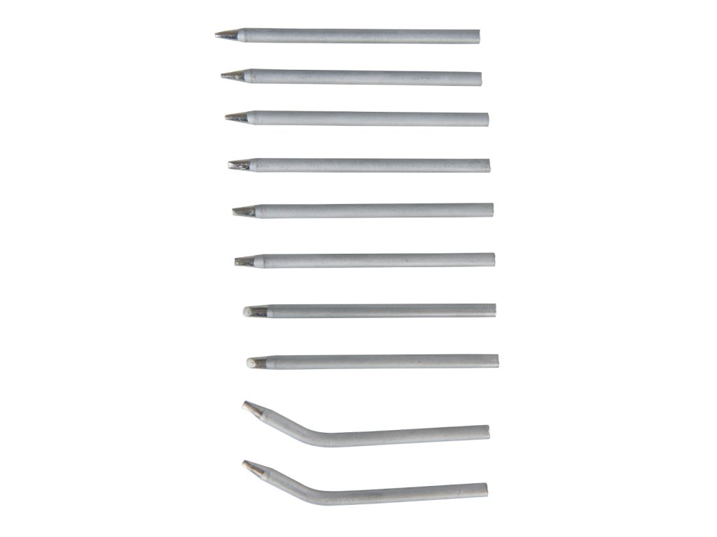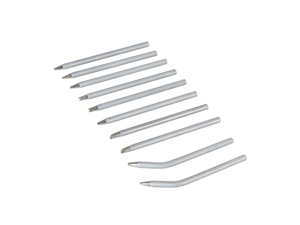 Tartalmaz 3 x ponthegyet, 3 x vágóhegyet, 2 x hajlított hegyet és 2 x bádoghegyet a konzerv huzalvégekhez. Kompatibilis a Silverline 15 W-os és a 25 W-os forrasztópáka (alkatrészszám 264572 643115). 675071 kompatibilis egy 40 W-os forrasztópákával (263572).