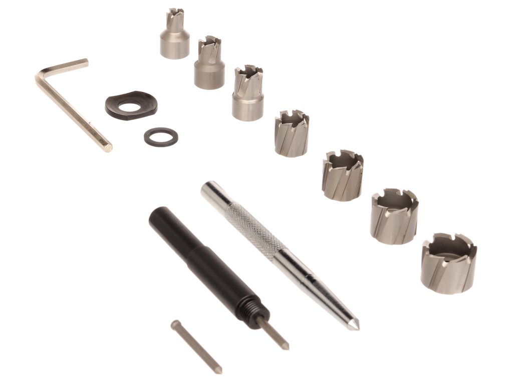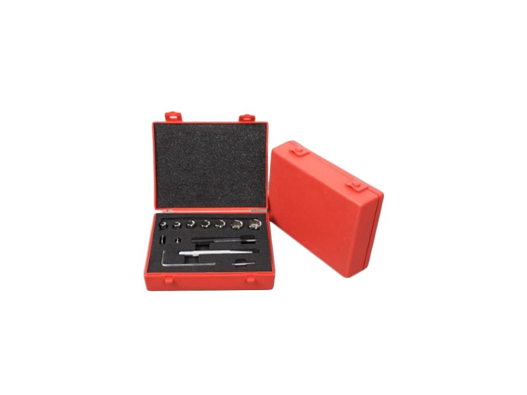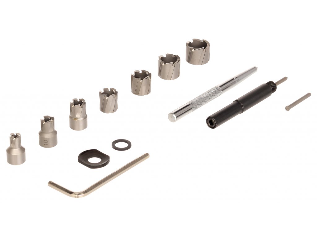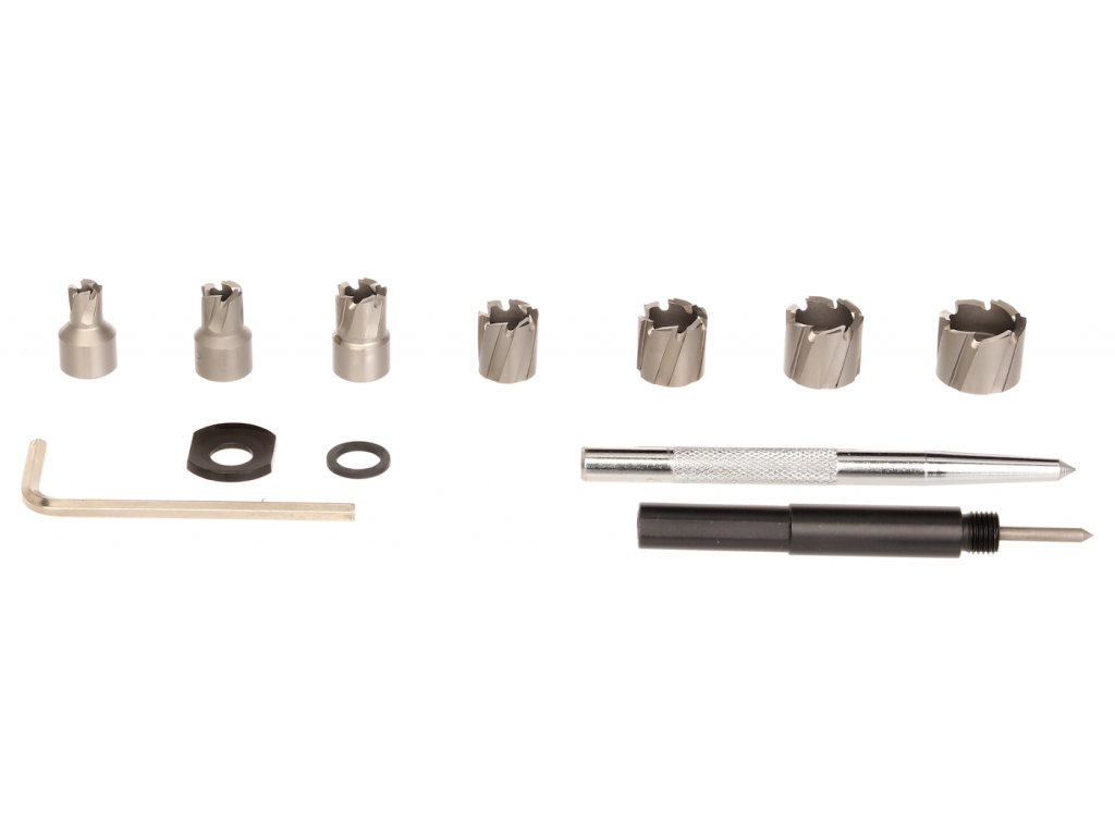 A fúróvezető pontos lyukakat garantál, amelyek alkalmasak fémlemezek, fémlemezek és műanyag csövek fúrására kézi és asztali fúrók használatakor. A mellékelt szár cserélhető koronái átmérője 8, 10, 12, 14, 16, 18 és 20 mm. A készletet egy aljzat egészíti ki a lyukak középpontjainak jelölésére és egy allen kulcs.