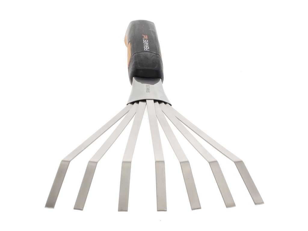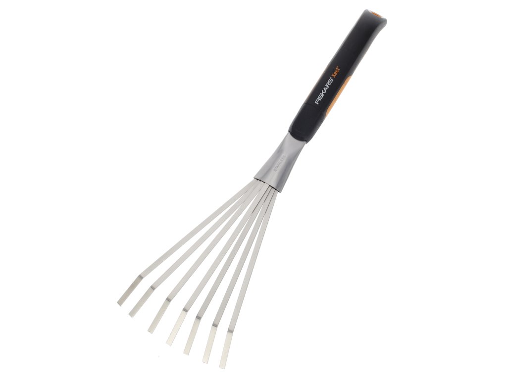 A kézi gereblyék ideálisak kis ágyakban és nehezen elérhető helyeken történő gereblyézéshez az ujjak ventilátor alakú alakja miatt. A munkadarab tartós rozsdamentes acélból készül. Az edzett alumíniumból készült ergonomikus fogantyú kényelmes Softgrip felülettel rendelkezik. A hosszabb fogantyú biztosítja a szerszám tökéletes egyensúlyát, lyukkal rendelkezik a könnyű lógáshoz és tároláshoz. Szélesség: 125 mm, 443 mm, 40 mm, súly: 200 g.