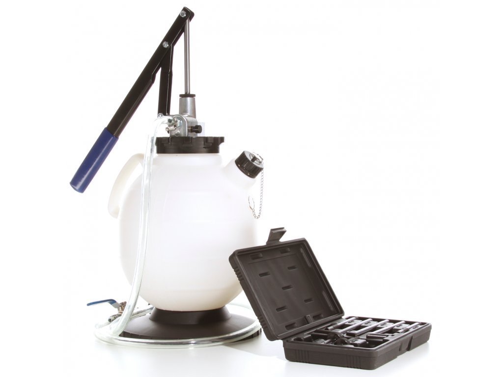A készlet tartalma: műanyag tartály pumpával, valamint adapter készlet a következő márkájú autókhoz: Ford, BMW, Honda, Nisan, VW/Audi, Porche, Mini Cooper, Mercedes, Volvo, Toyota/Lexus és Škoda. A készülékkel differenciálokban és sebességváltókban lehet olajat cserélni. A készülékbe üzemanyagot és oldószereket nem szabad tölteni. Az edény térfogata 7,5 l; 1 dugattyú lökettel 0,08 l olajat lehet pumpálni.