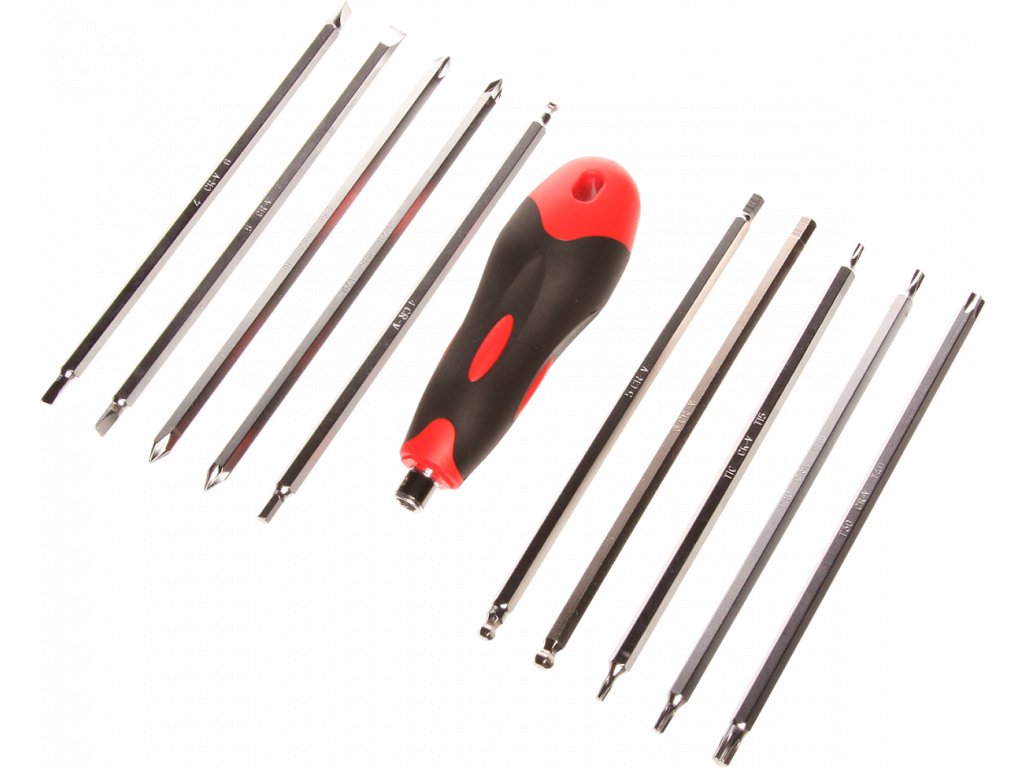 Kétoldalas, 175 mm hosszú bitek: S4 + S6, S5 + S7, PH1 + PH2, PZ1 + PZ2, T10 + T15, T20 + T25, T30 + T40, H4, H5, H4 mm. 1/4"-os fogantyú. Műanyag szerszámos dobozba csomagolva.