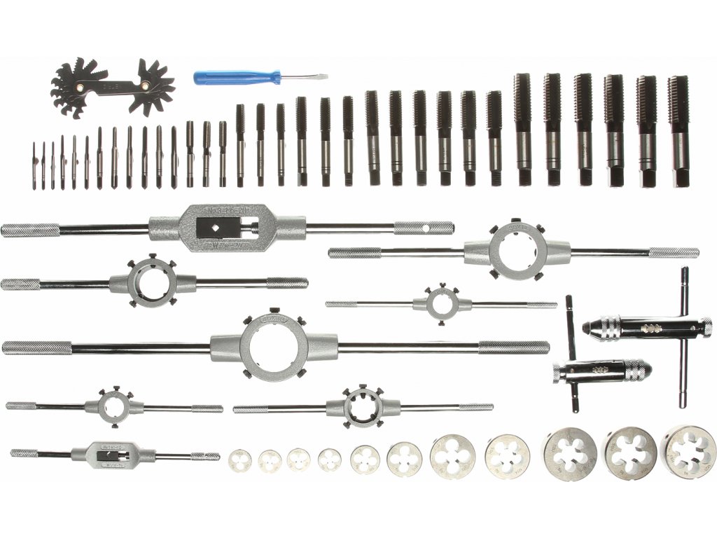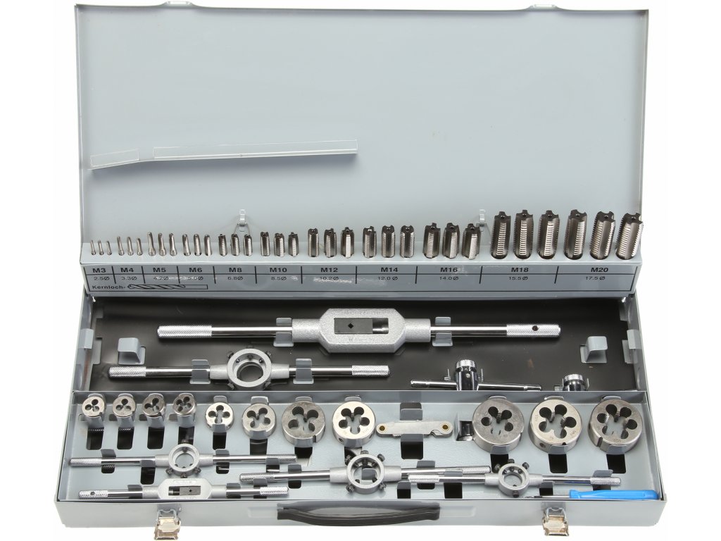 A lemezdobozba csomagolt menetvágó készlet tartalma: 11 db HSS menetmetsző, 33 db HSS menetfúró (DIN352 szerint), 6 hajtókar a szemekre, 2 hajtókar a menetvágóra, 2 racsnis hajtókar, csavarhúzó, menetsablon. Menetek méretei: M3, M4, M5, M6, M8, M10, M12, M14, M16, M18, M20.