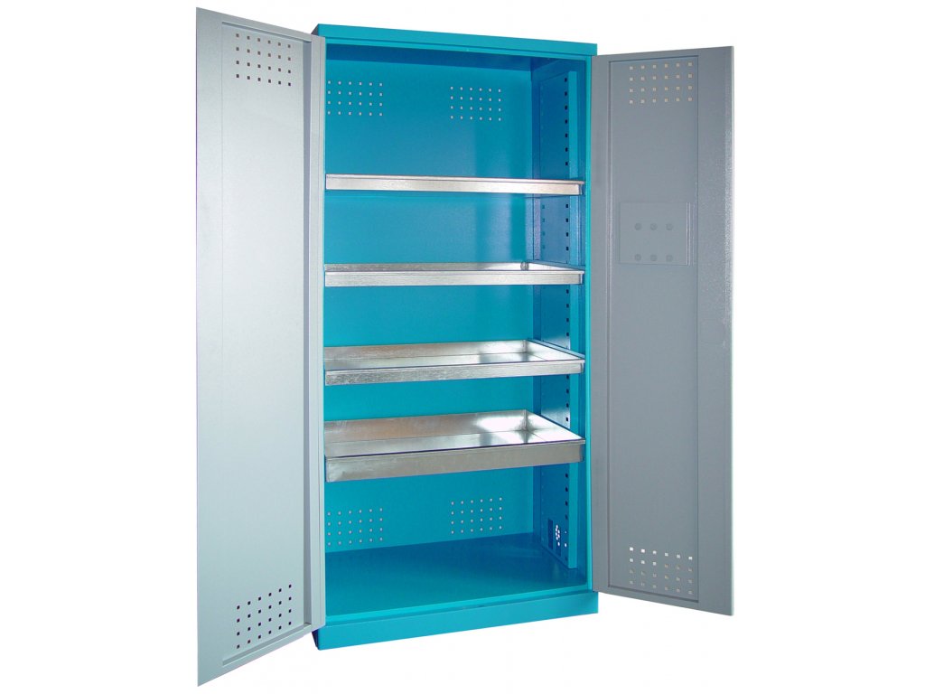 Fémszekrény, amely a gyúlékony/mérgező anyagok biztonságos tárolására alkalmas, szervizműhelyek, gyártóüzemek stb. Felszerelés: kétajtós szekrény (→ zár hengeres/tengelytávú zárral - dupla zár, 2 kulcs); 4 horganyzott fémlemezből készült kihúzható tálca (→ opcionális magasságbeállítás, terhelhetőség: 30 kg); szekrény szellőztető rendszer (→ perforált karosszéria /ajtó). Felépítés: acélkeret lábazattal (→ 1,920 × 920 × 380 mm, lekerekített élek). Porbevonat, szín: RAL 5015 (korpusz), RAL 7001 (ajtó). Összeszerelt állapotban szállítva.