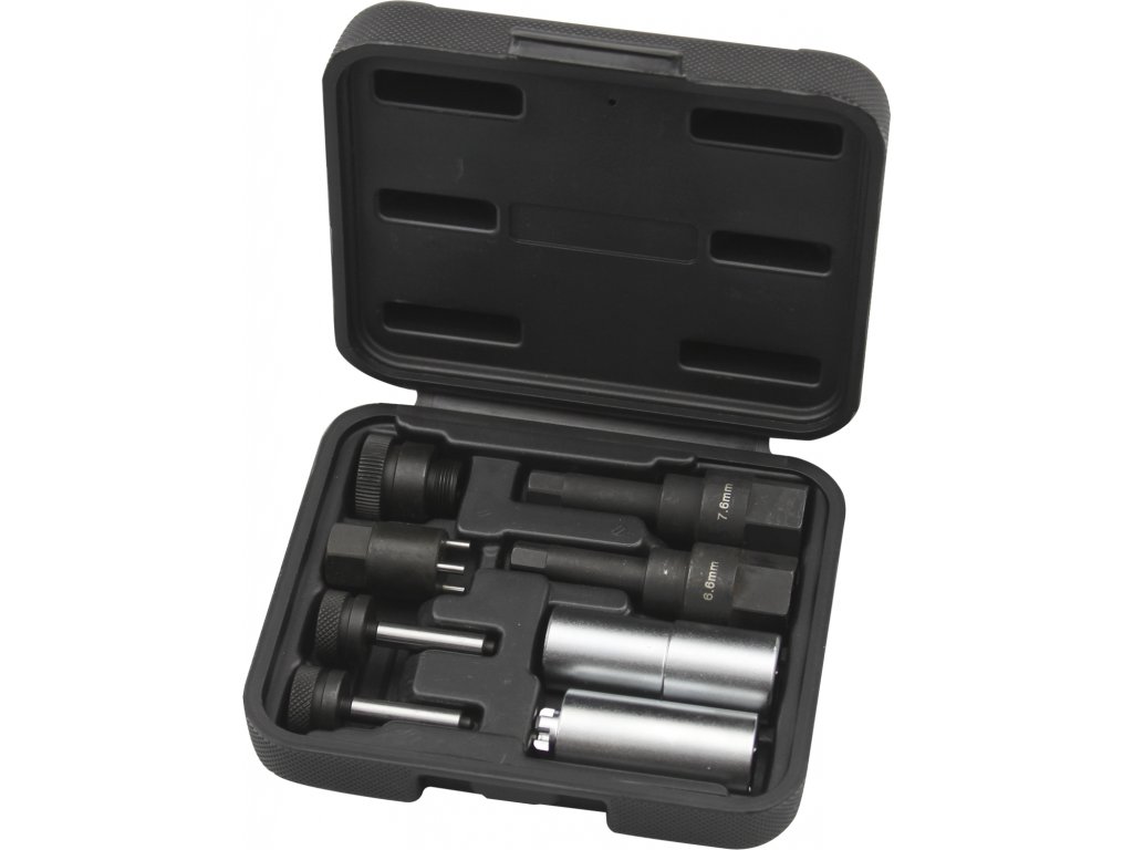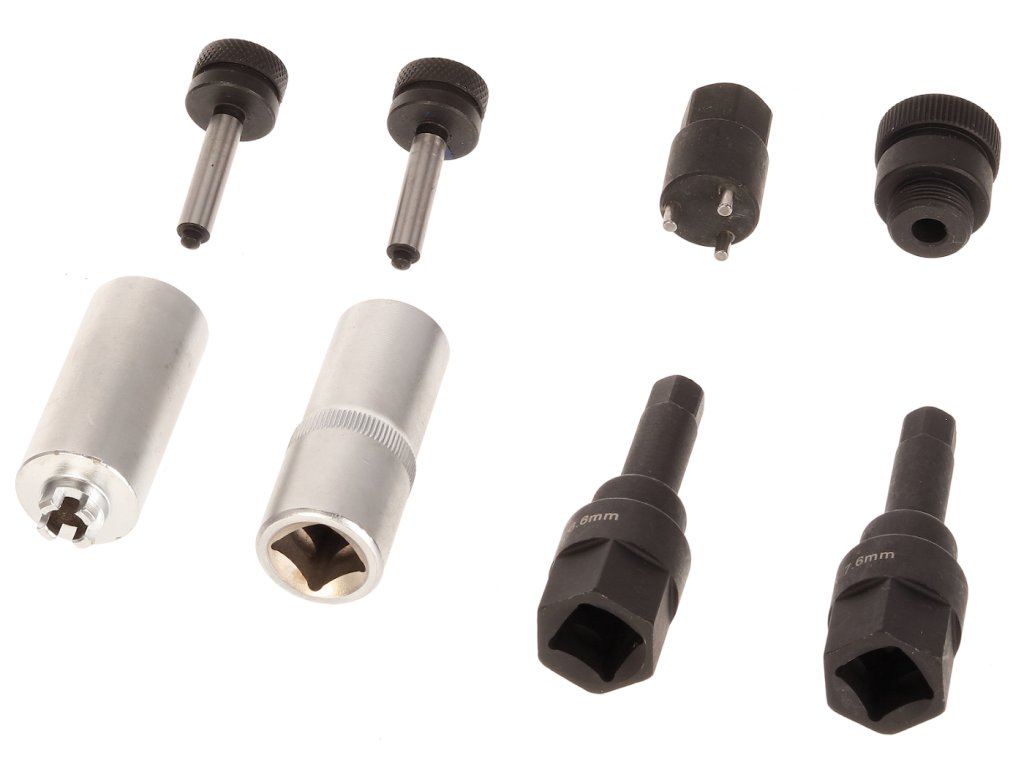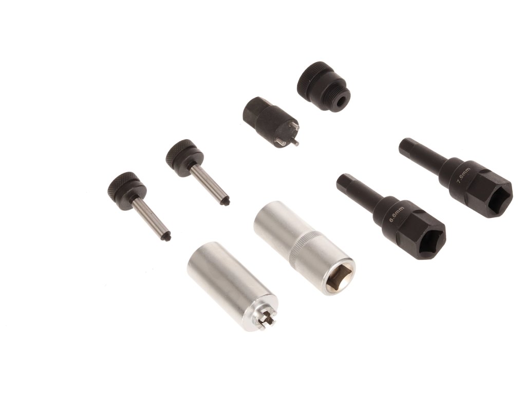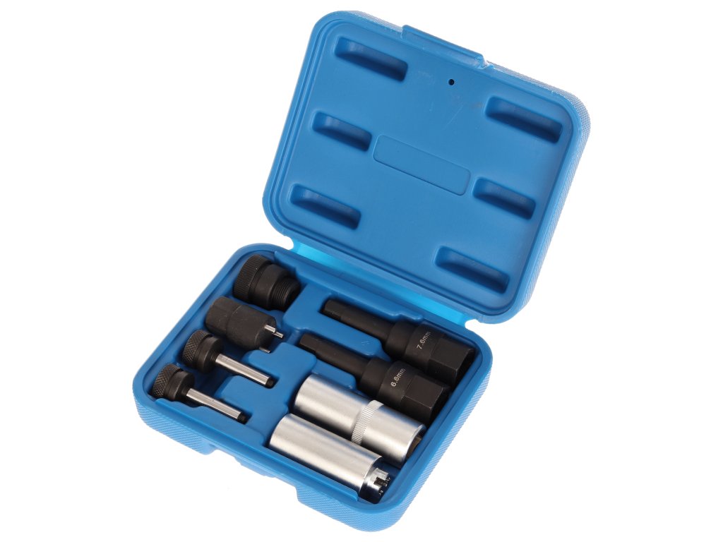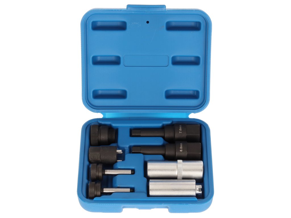 8 alkatrészt tartalmaz Bosch, Denso és Siemens injektorok felszereléséhez és szétszereléséhez. Műanyag kazettában szállítják.