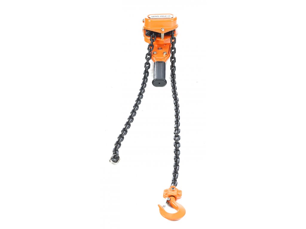 Láncos emelő csörlő racsnis markolattal. A láncos csiga fel van szerelve láncszemekből álló lánccal, egyszerű szerkezettel és minimális karbantartású robusztus kivitelben készült. A fogazott erőátviteli rendszer csökkenti megterhelést, növeli a teljesítményt és a horgok biztosító csappantyúi fokozzák az üzemi biztonságot. A horgok minimális távolsága 295 mm; a horgok nyílásainak szélessége 37 mm; a teljes szélessége 128 mm; mélység 148 mm; a kar hossza 256 mm.