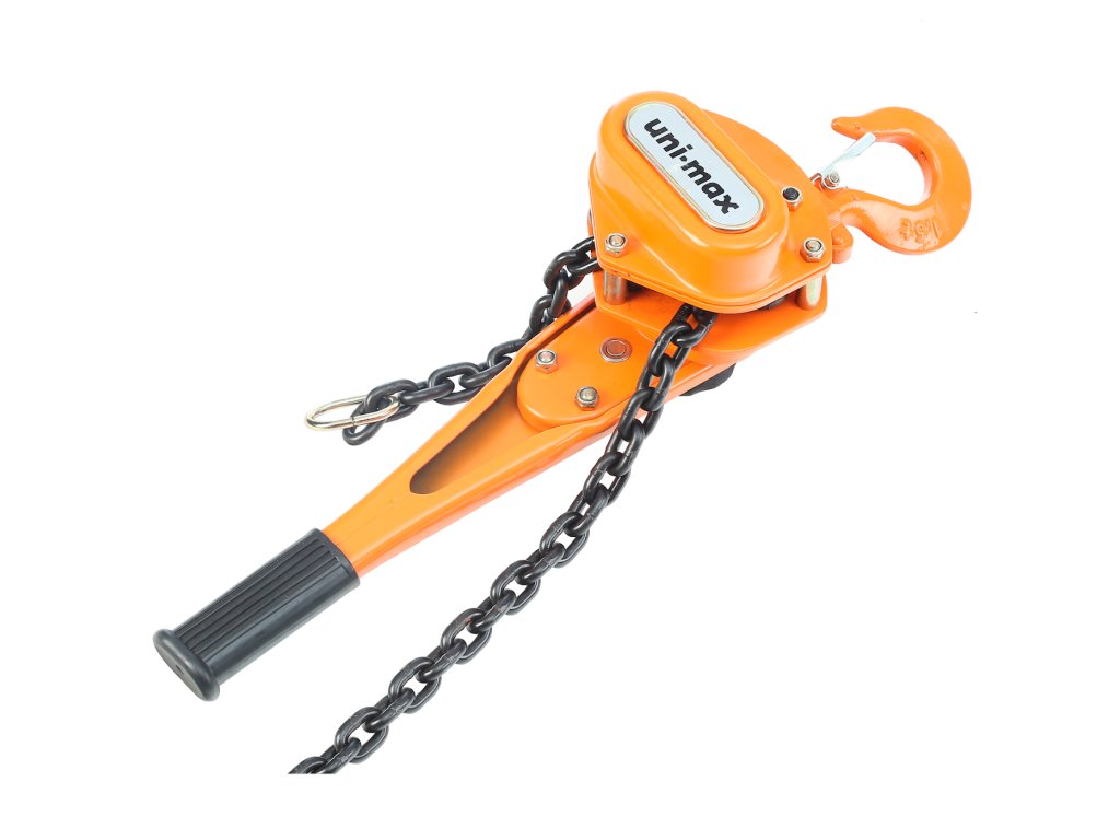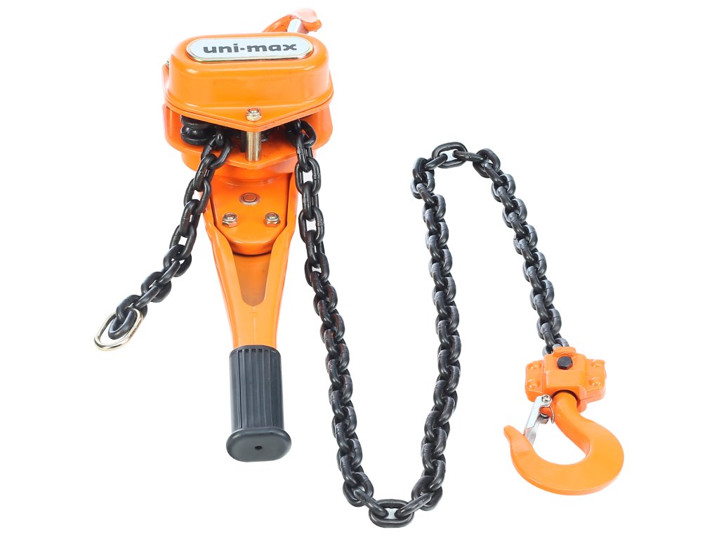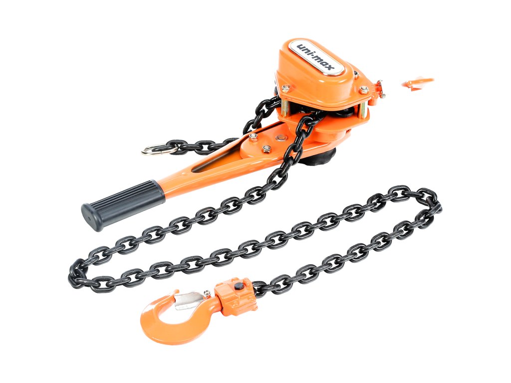 Láncos emelő csörlő racsnis markolattal. A láncos csiga fel van szerelve láncszemekből álló lánccal, egyszerű szerkezettel és minimális karbantartású robusztus kivitelben készült. A fogazott erőátviteli rendszer csökkenti megterhelést, növeli a teljesítményt és a horgok biztosító csappantyúi fokozzák az üzemi biztonságot. A horgok minimális távolsága 335 mm; a horgok nyílásainak szélessége 47 mm; a teljes szélessége 148 mm; mélység 163 mm; a kar hossza 368 mm.