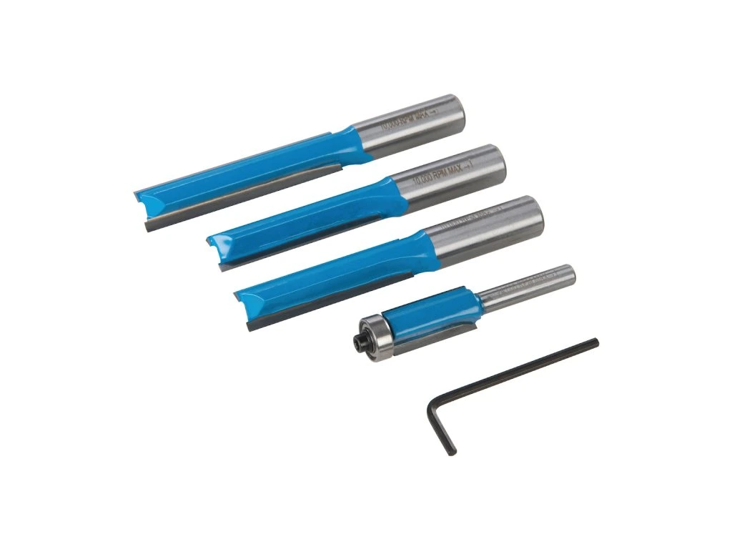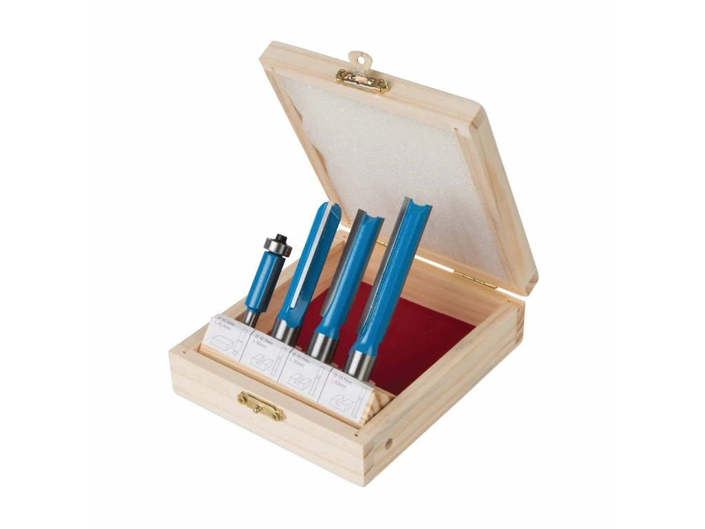 Átfogó vágókészlet konyhai szerelők számára. TCT keményfém acél élek és erős, edzett acél szárak. Egy fából készült tárolótokban szállítják. Tartalma: 1 × 63 × 12,7 mm-es közvetlen vágóvágó 12 mm-es szárral; 2 × egyenes vágóvágó 50 × 12,7 mm 12 mm-es szárral és 1 × igazítás maróvágó 25,4 × 12,7 mm-es szárral és csapágyjal.