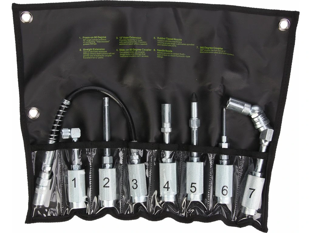 A készletben hét darab kenőtoldalék található. A készletben 2 db 90°-os zsírzótoldalék, egyenes hosszabbító, 12″-os bővítő toldalék, gumis benyomó toldalék, tűs benyomó toldalék, 360°-os zsírzótoldalék található. A standard kenőkészülékekhez lehet csatlakoztatni.