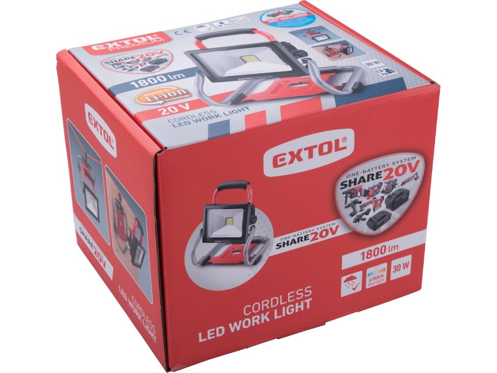 A LED reflektorfény kellemes fehér fény forrása, amely minőségében megfelel a napfénynek. A nagy teljesítménynek és az egyszerű és könnyen állítható állványnak köszönhetően az ideális munkalámpa. A reflektor készen áll a különböző könnyű rögzítésre is - kötélre vagy körömre akasztható, de falra vagy oszlopra is csavarható. Az akkumulátor átlátszó fedéllel van borítva, és segítségével a reflektor IP44 védelmet ér el. A SHARE20 V akkumulátor tápegységnek köszönhetően biztosítható a fény folyamatos működése, egyszerűen helyezze be a feltöltött akkumulátort és lépjen tovább. Az akkumulátor az EXTOL SHARE20 V sorozat minden típusú szerszámában használható. A Li-ion akkumulátor nagyon lassan veszít energiát az önkisülés miatt, és hosszú ideig töltődik és használatra kész.- Akkumulátor: 20 V Li-ion súly akkumulátorral: 2 kg- Akkumulátor kapacitása: 2000 mAh- Védelem: IP44- Akkumulátor töltés kb.: 80 perc- LED energiafogyasztás: 30 W- Fényáram: 1800 lm- Színhőmérséklet: 6000K