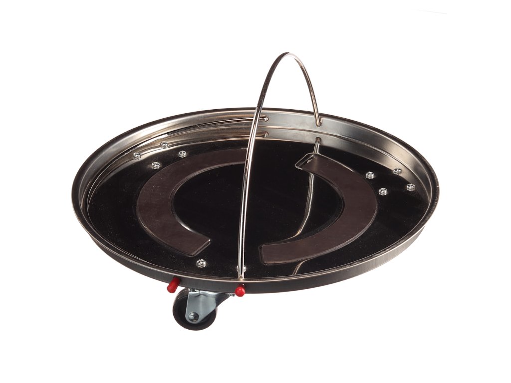 Átmérő 343 mm, mélység 28 mm. Anyaga rozsdamentes acél; 0,8 mm; PVC fenék; a 2 db mágnes mérete 180 x 48 mm.