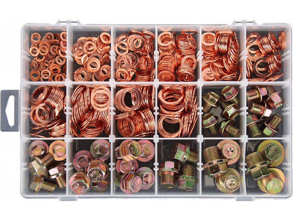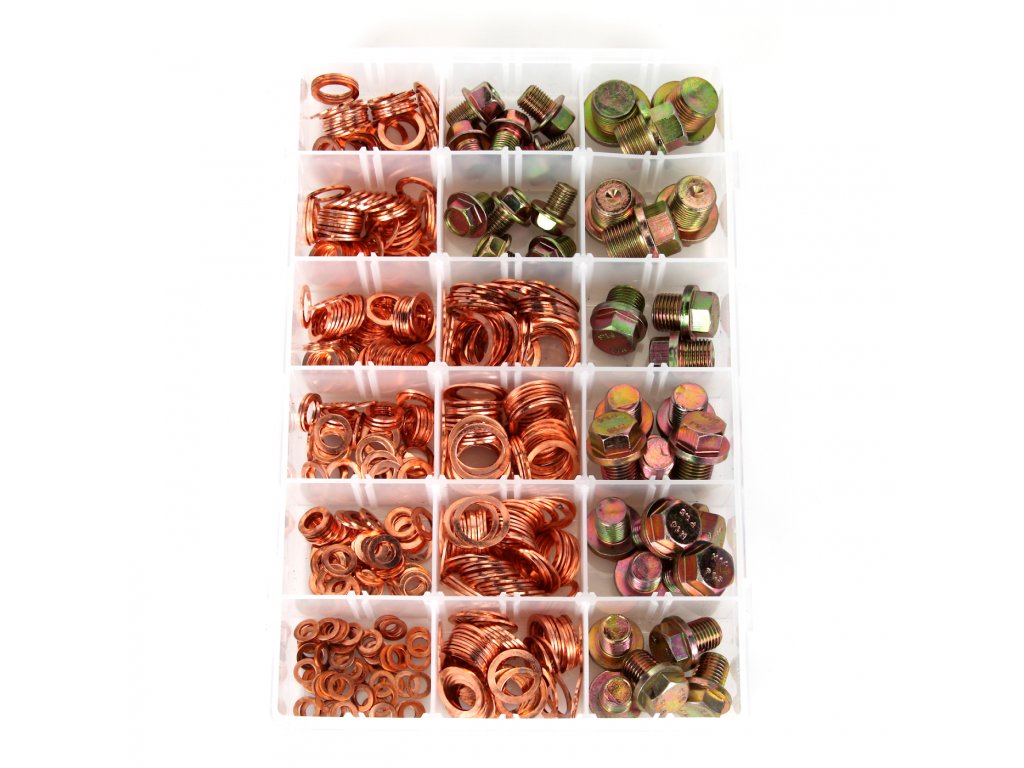 Univerzálisan használható készlet, elsősorban gépjárművek olajteknőinek a javításához. 50-50 darab rézalátétet tartalmaz a következő átmérőkből: 6, 8, 10, 12, 13, 14, 15, 16, 18 és 20 mm, menetes dugók: 10 × 1,25 × 12,4 mm, 12 × 1,25 × 12,4 mm, 13 × 1,5 × 15,5 mm, 14 × 1,5 × 15,5 mm, 15 × 1,5 × 15,1 mm (5-5 darab) és 16 × 1,5 × 13 mm, 18 × 1,5 × 16 mm, 20 × 1,5 × 13 mm (3-3 darab). A készlet 534 darabja jól áttekinthető módon, rekeszes műanyag dobozban van elhelyezve.