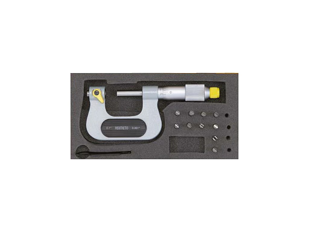 Analóg mikrométer rögzített, nem forgó orsóval, surlódó dobbal és acél lakkozott kerettel öt pár érintővel különböző menetek mérésére (a felső szög 60°, különböző emelkedés). Alaptartozékok: S kulcs, 5 pár érintő, jótállási jegy, használati útmutató, kalibráló tanúsítvány, műanyag tok.