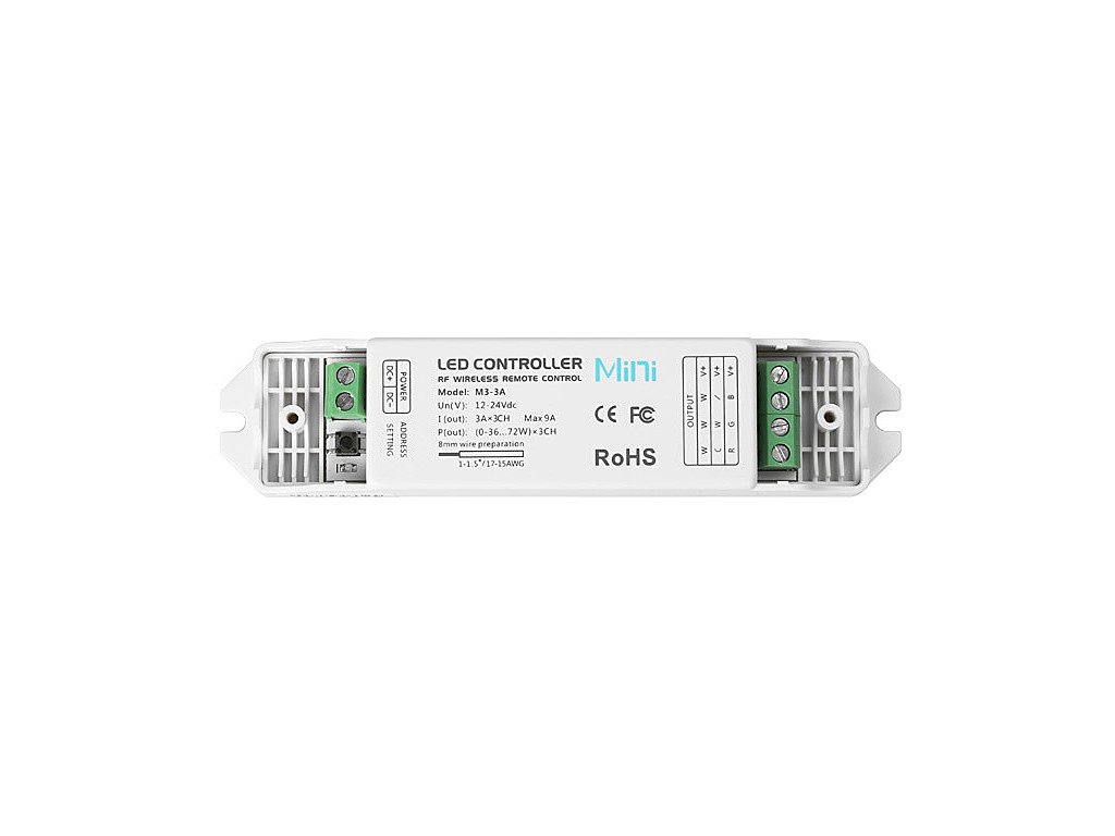 A csomag tartalma 1 db MINI CONTROLLER - ún. vevő (lásd az ábrát), a csomag nem tartalmazza a MINI vezérlőt - bármely típusú MINI VEZÉRLŐ KÉSZLETTEL párosítható. A MINI VEZÉRLŐ KÉSZLET rendszerint tartalmaz egy MINI VEZÉRLŐT; amennyiben több lámpát kíván egy mini vezérlővel irányítani, bármennyi ilyen különálló vezérlőt vásárolhat. Méretek 135 × 30 × 20 mm, Feszültség 12/24 V DC, Áramerősség max. 3 A körönként, legfeljebb három kör.