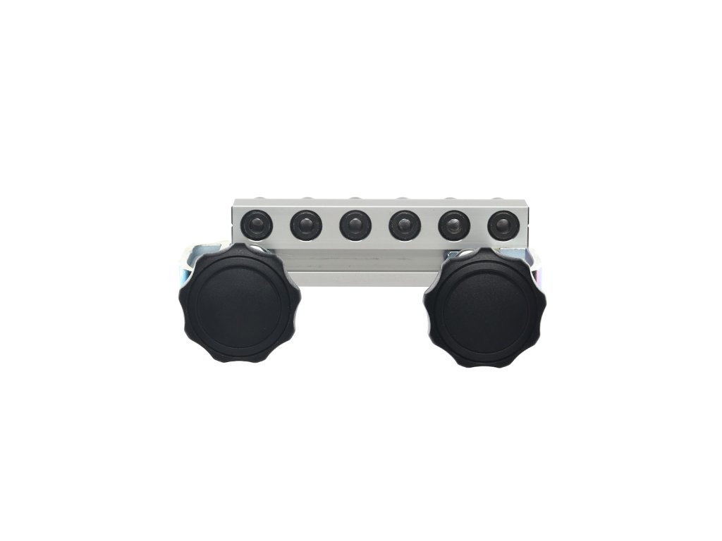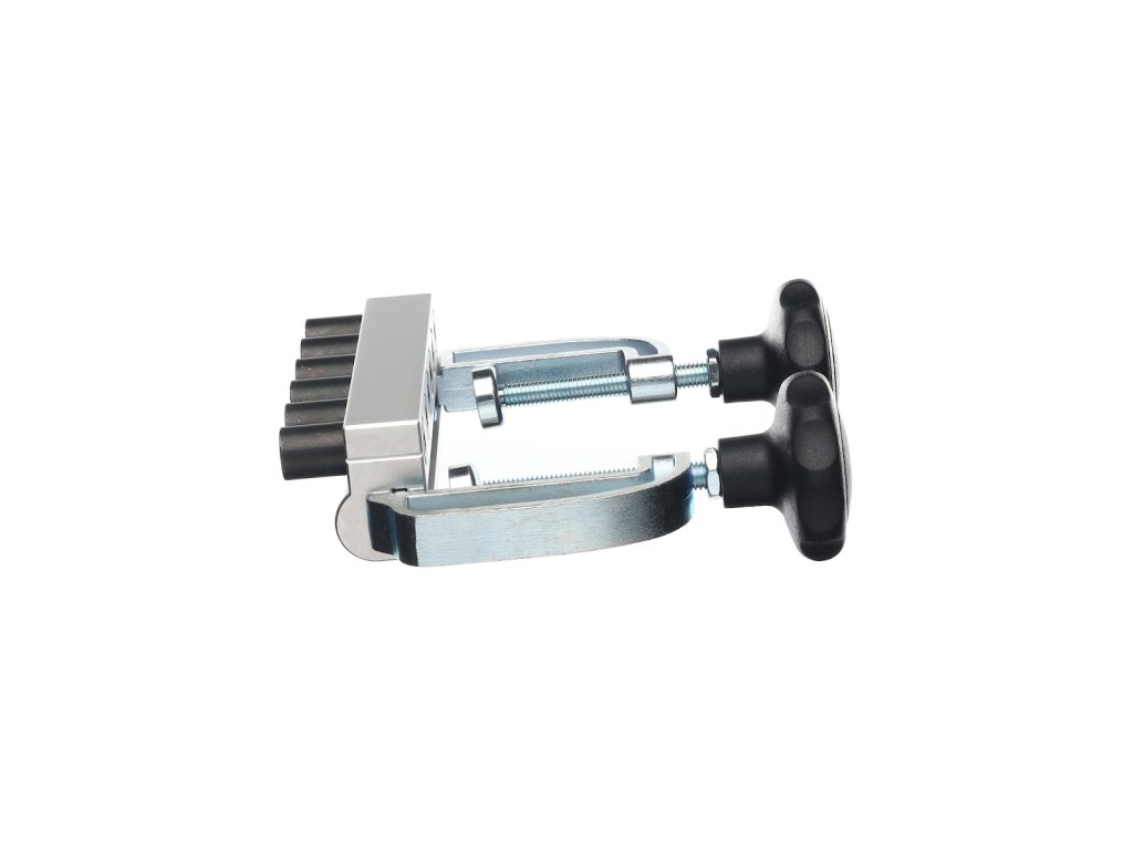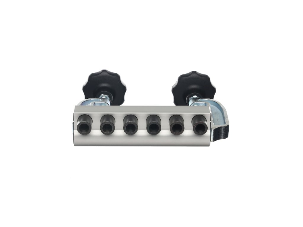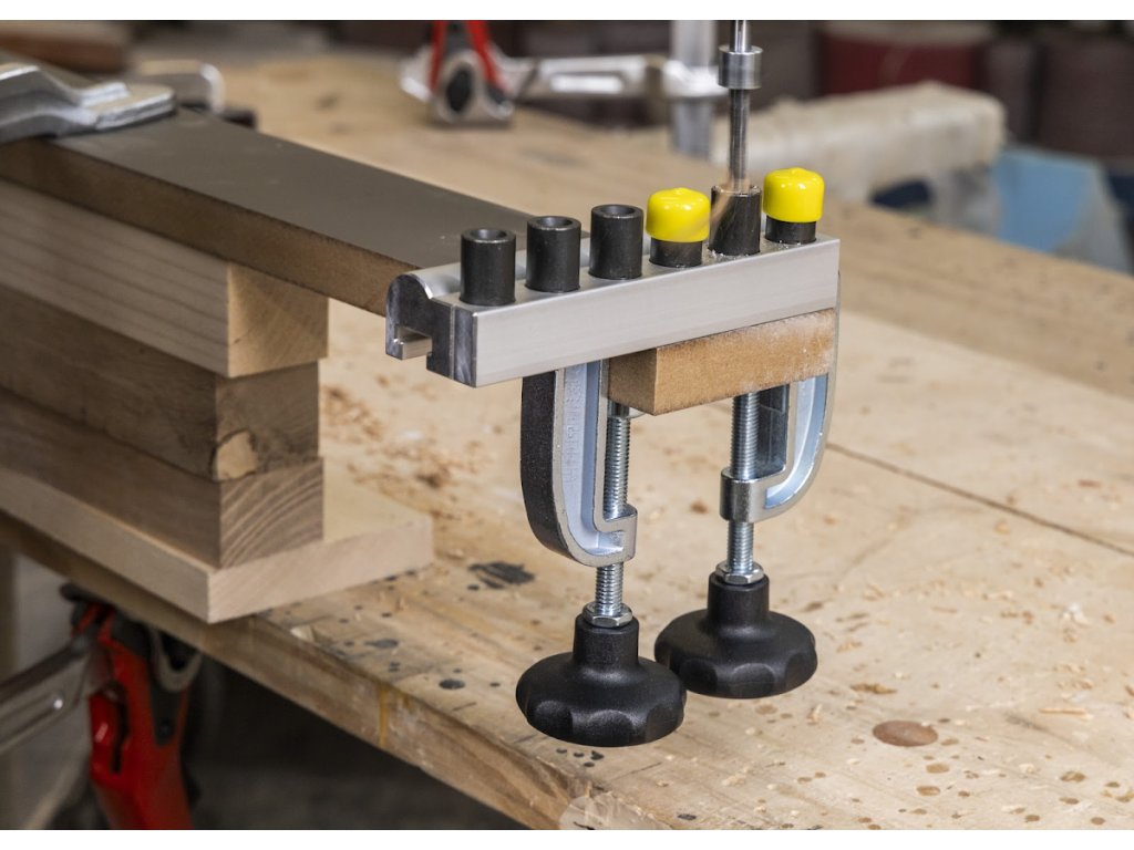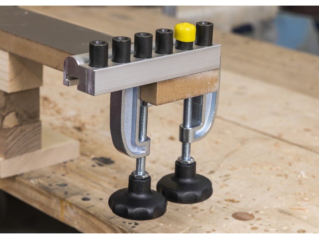 A mélységütköző most INGYEN jár minden készlethez. Színes zárósapkák a nagyobb termelékenységhez és a könnyebb tájékozódáshoz (mos INGYEN minden készlethez). A készülék szélén egy jel mutatja a fúróperselyek közepét, amely megkönnyíti a készülék pontos beállítását. Az oldalütköző, amely a deszka széléhez való pontos igazítást szolgálja, az egyik szorítónak a része! (csavarral lehet felerősíteni, így nem kell minden felfogáskor újból beállítani). A készüléktest megerősített masszív profilból készül, ami a konkurens termékekhez képes sokkal nagyobb merevséget garantál. Mindenekelőtt tömör fa megmunkálásakor értékelni fogja, hogy a készüléket akár 35 mm-es deszkához is hozzá lehet erősíteni!!!