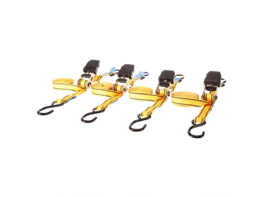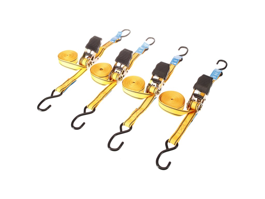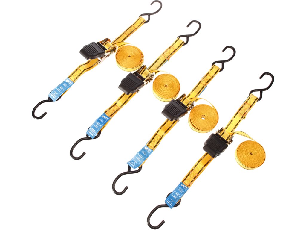 Négyrészes feszítőpánt szett. Acél, horganyzott racsni. Pánt hossza 5 m, szélessége 25 mm, rögzítőteljesítmény 225 kg, szakítószilárdság 450 kg.
