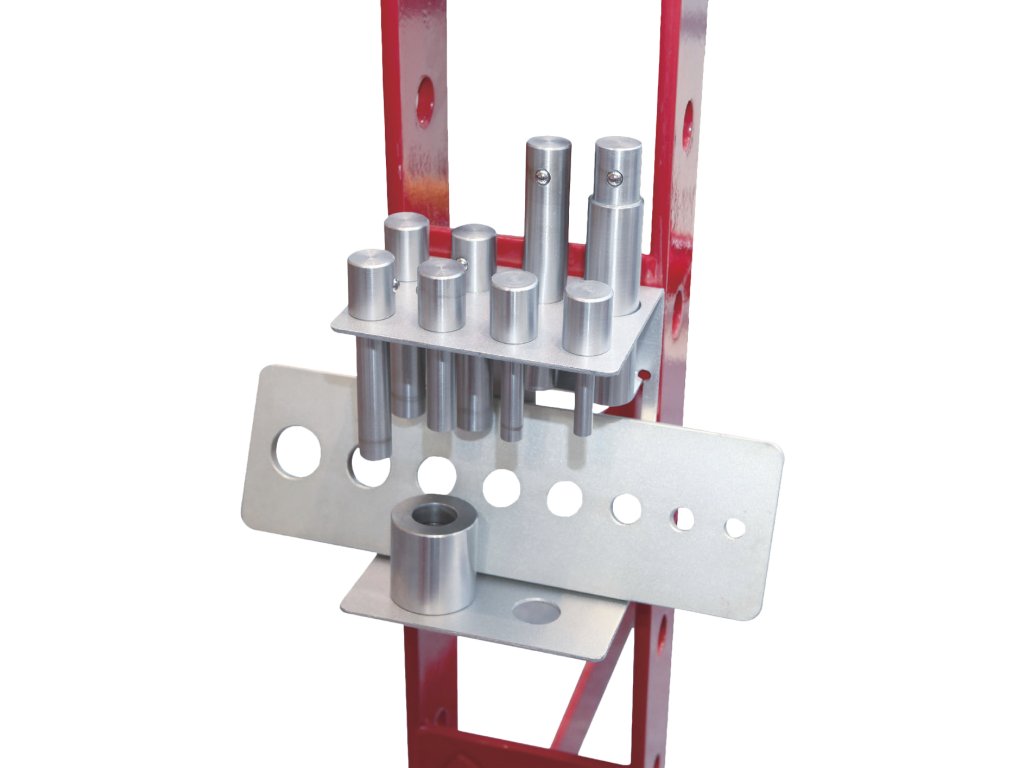 Alkalmas tengelyek, csapok, tokmányok és további alkatrészek sajtolására a gép- és autóipari technikában. A készlet tartalma: a sajtolóhoz rögzítés tartója és a 310 × 100 × 10 mm sajtolóanya, szűkítő és beütő ø10 × 50, ø12 × 60, ø16 × 60, ø18 × 85, ø20 × 85, ø22 × 85, ø25 × 105 a ø30 × 110 mm. A rögzítőszár átmérője 24,5 mm, anyaga C45-ös hőedzésű szénacél.