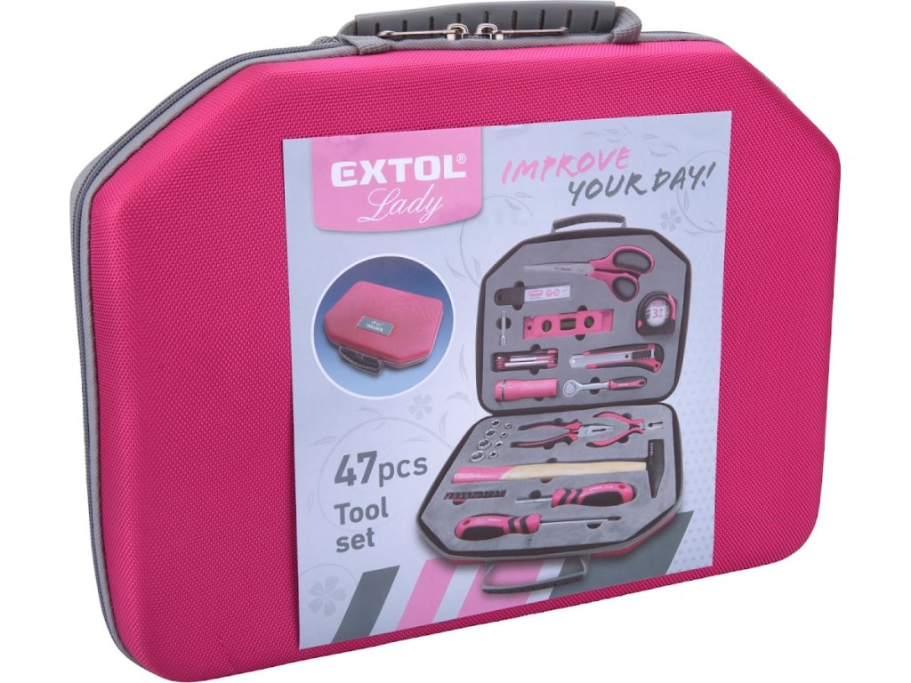 - aljzatfej: 1/4": 5 - 6 - 7 - 8 - 10 - 12 - 13 - 14 mm (CrV)- tippek: 1/4"(L25 mm): (-)3 - 4 - 5 - 6 mm, PH0 - 1 - 2, PZ0 - 1 - 2- inbus: 1,5 - 2 - 2 - 2 - 2,5 - 3 - 4 - 5 - 6 mm (CrV)- kalapács: fa fogantyúval 300 g- fogók: kombinált 160 mm, félkörös egyenes 115 mm- anyag: CrV- mérő: tekercselés 3 m × 6 mm- kés: megszakító fém megerősítéssel 18 mm, 10 db tartalék 18 mm-es él egy dobozban - egyéb alkatrészek: párlatszint 170 mm, LED zseblámpa 60 lm, irodai olló 190 mm - hosszabbító: 1/4" × 50 mm (CrV)- racsnis: 1/4"(45T) (CrV)- csavarhúzó: PH2 × 100 mm, (CrV), mágneses 1/4" csúcsokhoz - 1/4" csúcsokhoz