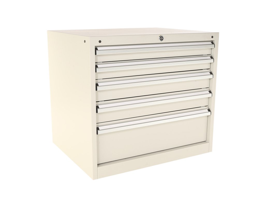 Fém zárható szerszámtartály, Méretek 723 × 580 × 650 mm. 5 fiók. Két fiók 75 mm magas, két fiók 100 mm, egy aljzat 200 mm. A tartály kerekek nélkül van, és alkalmas az asztal munkalapja alatt.