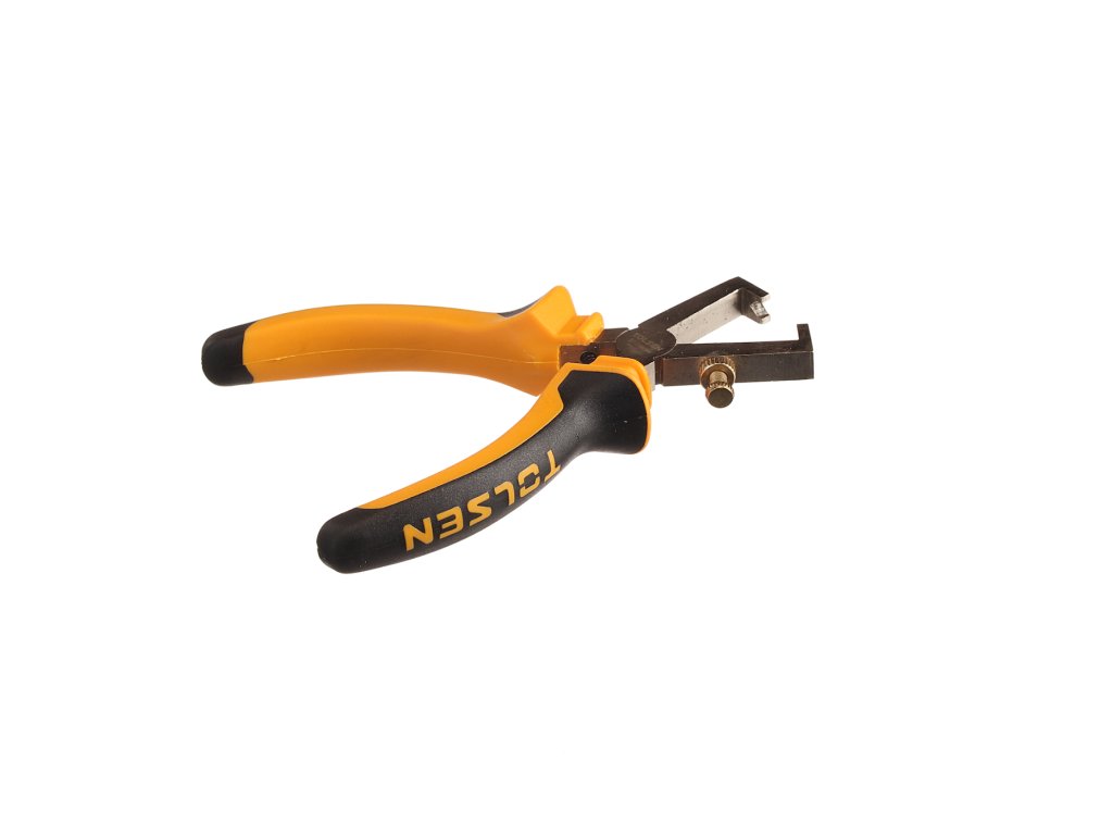 Kovácsolt acél, nikkel bevonat. Kétszínű puha fogású fogantyú. Szigetelések lehúzásához használható, a csavarral beállítható a vezeték átmérője.