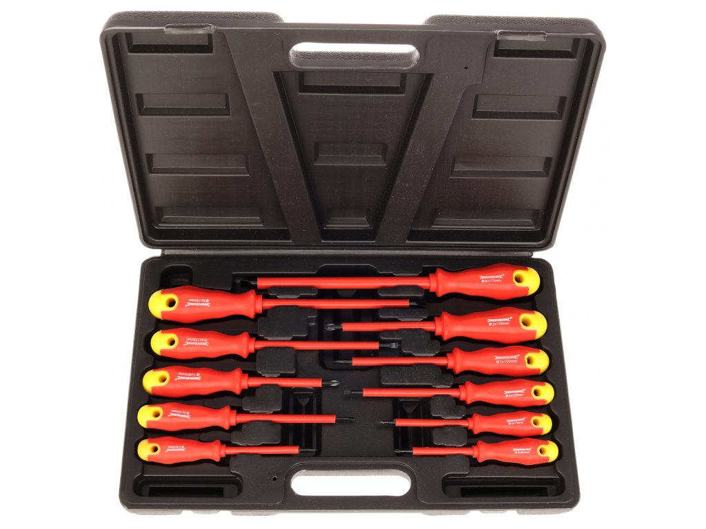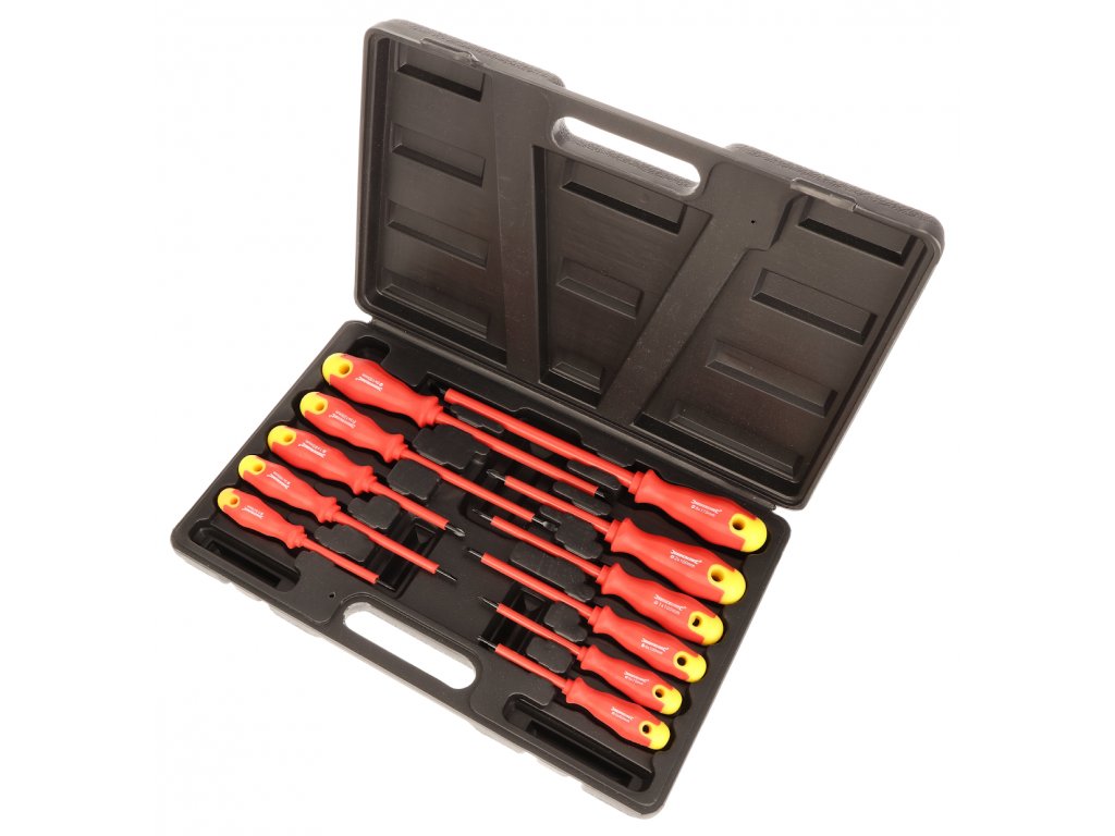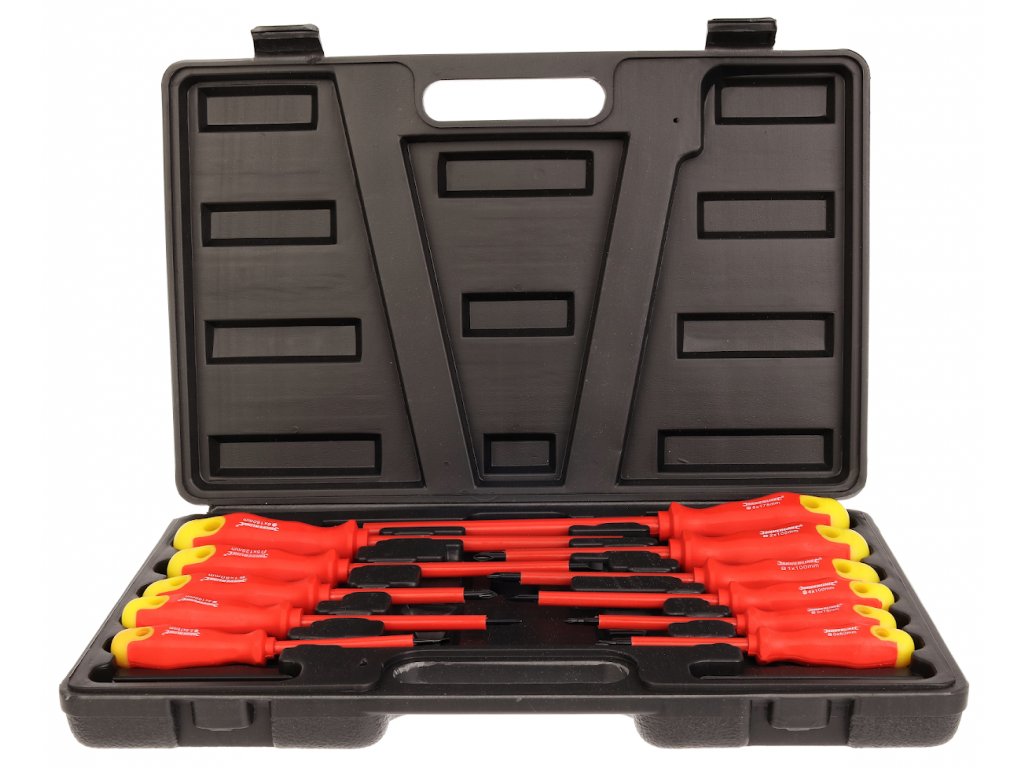 Edzett króm-vanádium és szigetelt szárak kémiailag megfeketedett hrC50–55 keménységű mágneses hegyekkel, ergonomikus fogantyúkkal, hatszögletű profillal. Ideális elektromos alacsony áramú és autóipari munkákhoz. A csomagolás lapos: 2,5 × 75 mm; 3 × 100 mm; 4 × 100 mm; 5 × 125 mm; 6 × 150 mm, 8 × 175 mm; kereszt PH0 × 60; PH0 × 75; PH1 × 80; PH1 × 100 és PH2 × 100 mm-es csavarhúzók. Műanyag tokban szállítva.