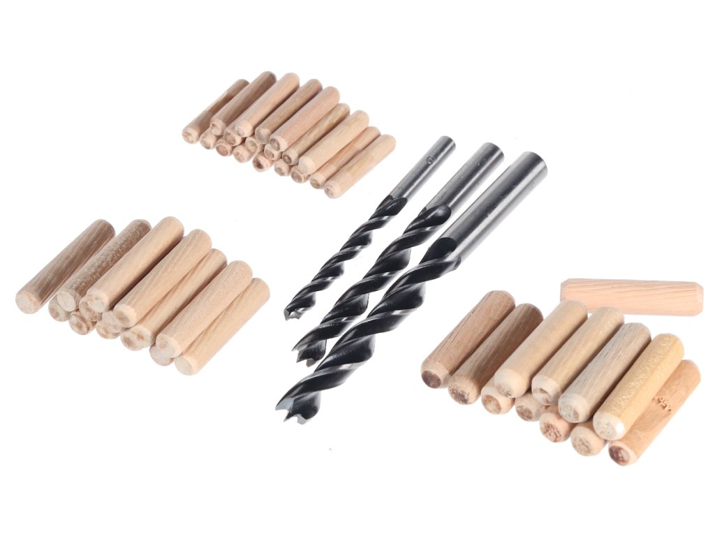 A készlet tartalma: 3 szénacél fafúrószár – ø 6, ø 8 a ø 10 mm és 44 fatipli – ø 6 × 30 mm ( 18 db ), ø 8 × 40 mm ( 14 db ) és ø 10 × 40 mm ( 12 db ).