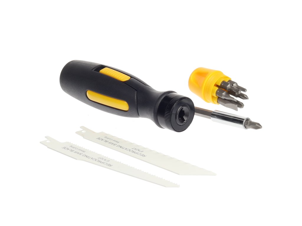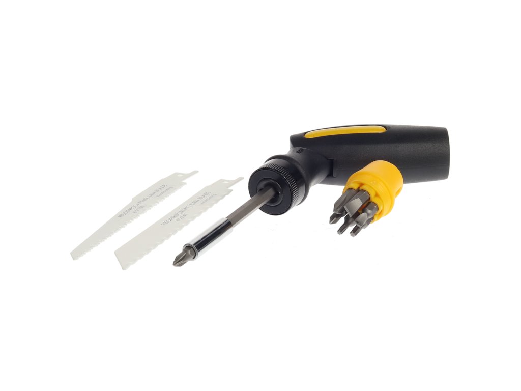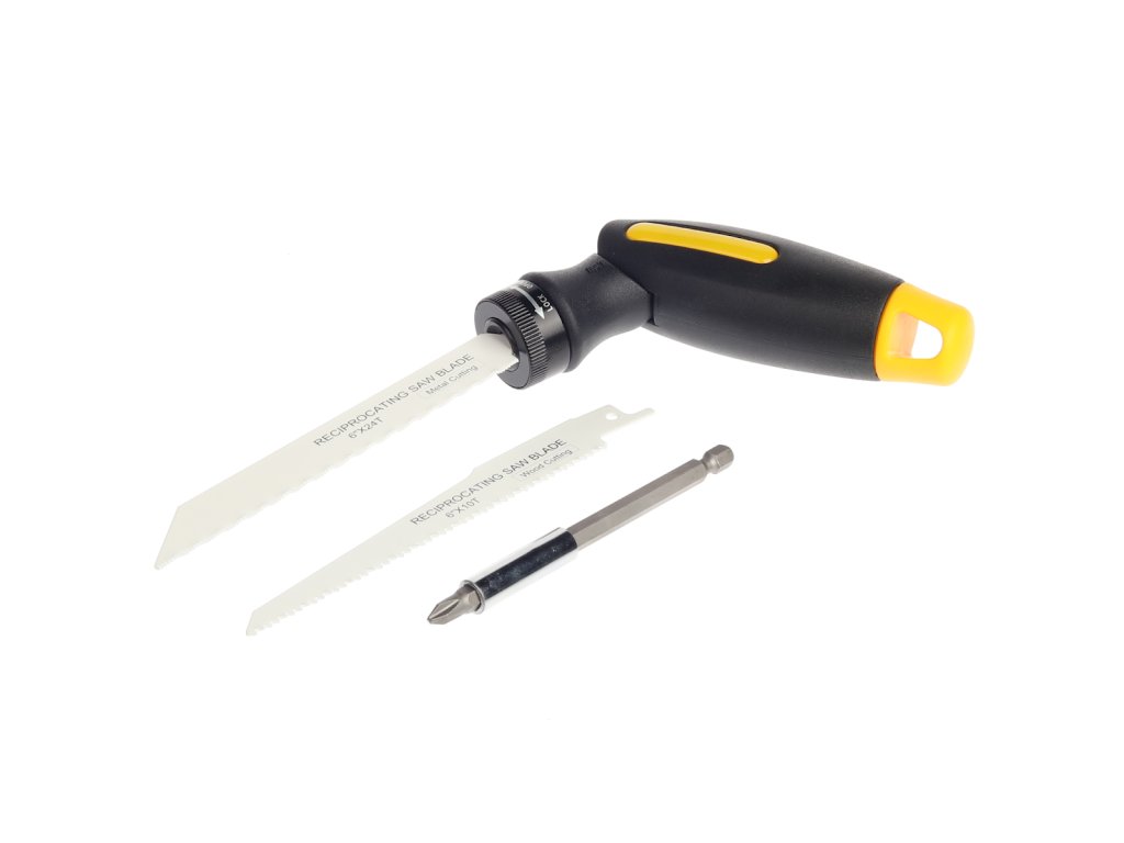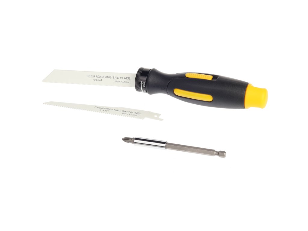 Vágáshoz és csavarozáshoz. Tartalmaz 1 db ABS és PP anyagból készült fogantyút 60°-ban állítható csatlakozással, 1 db 152 mm-es fűrészlapot HCS szénacélból, 1 db 152 mm-es fűrészlapot fémekhez HCS szénacélból, 6 db 25 mm-es bitfejet (PH1, PH2, Ph3, SL5, SL6 és SL7) S2 anyagból, 1 db hosszabbítót 100 mm-es mágnessel és 1 db vászontokot.