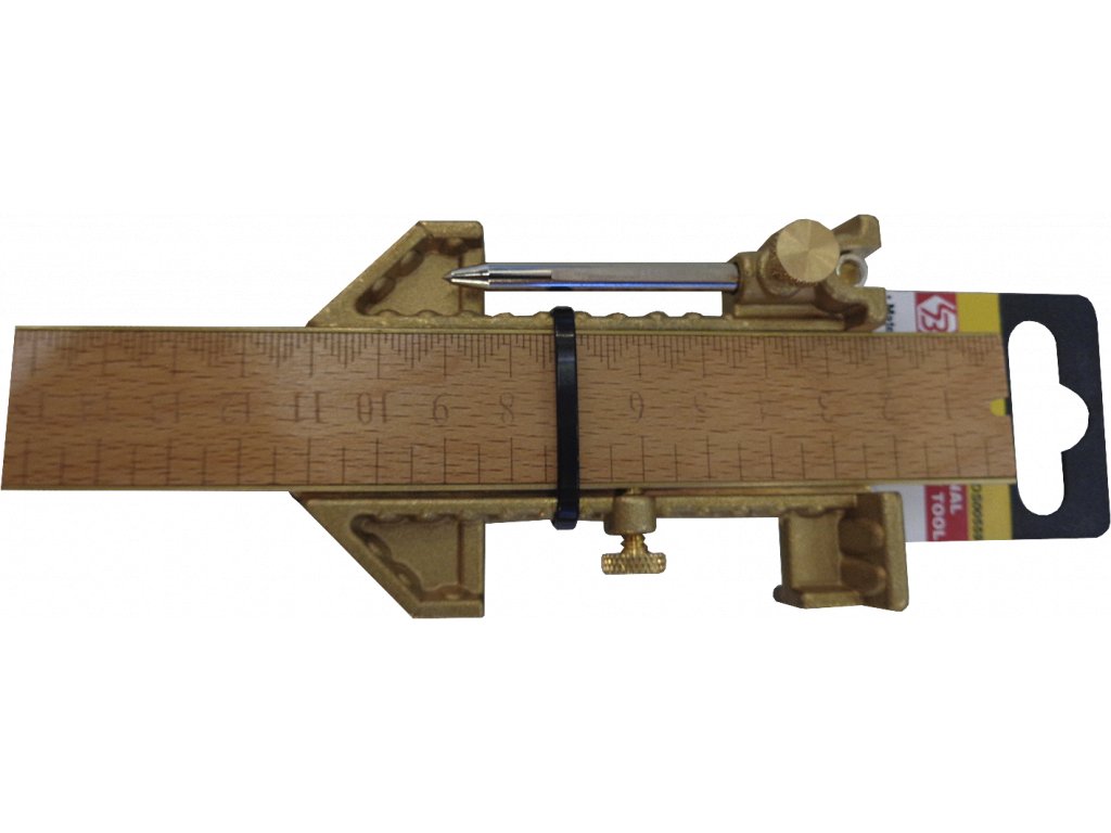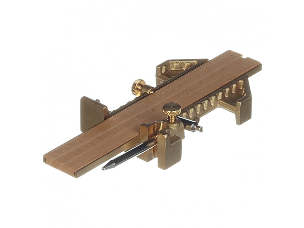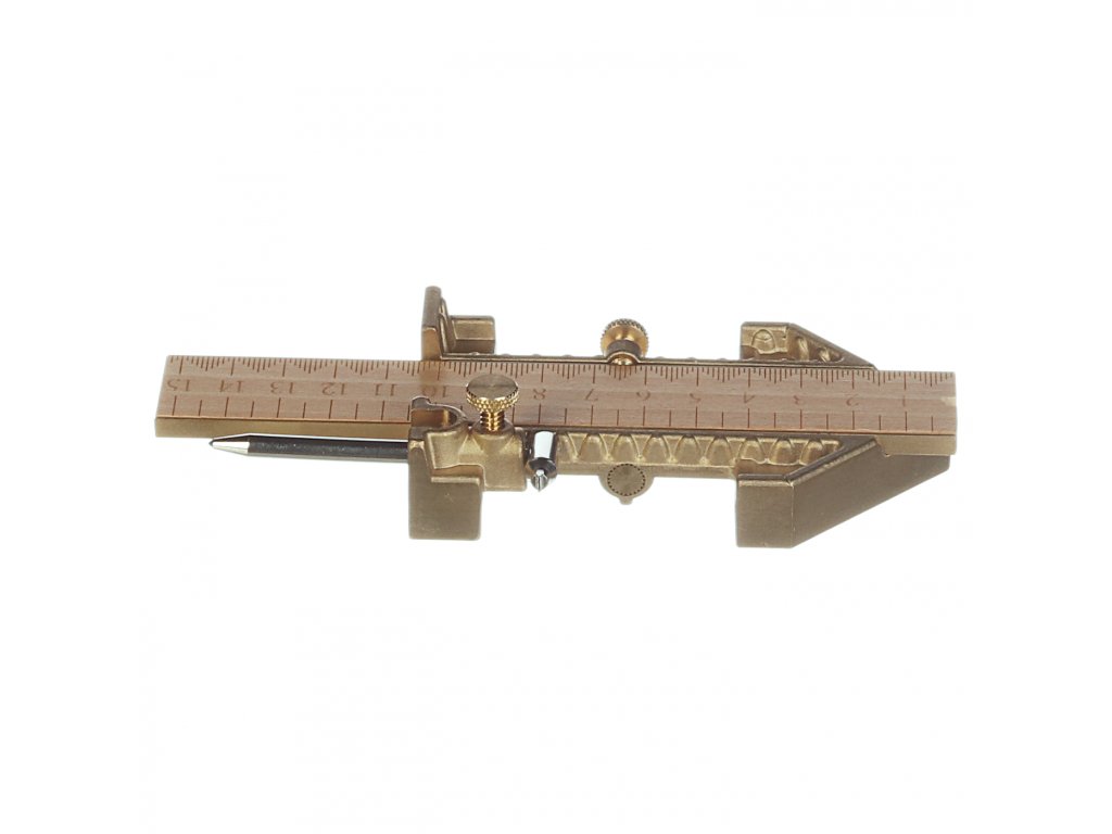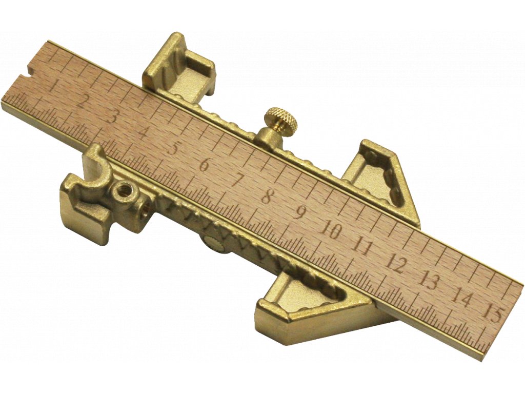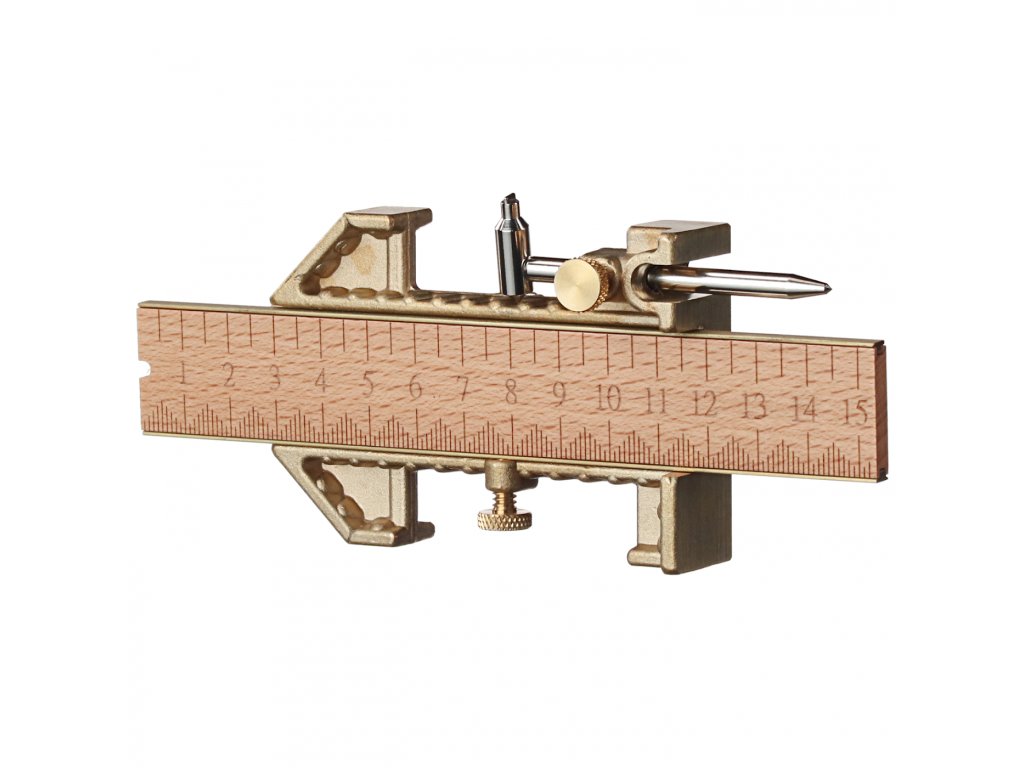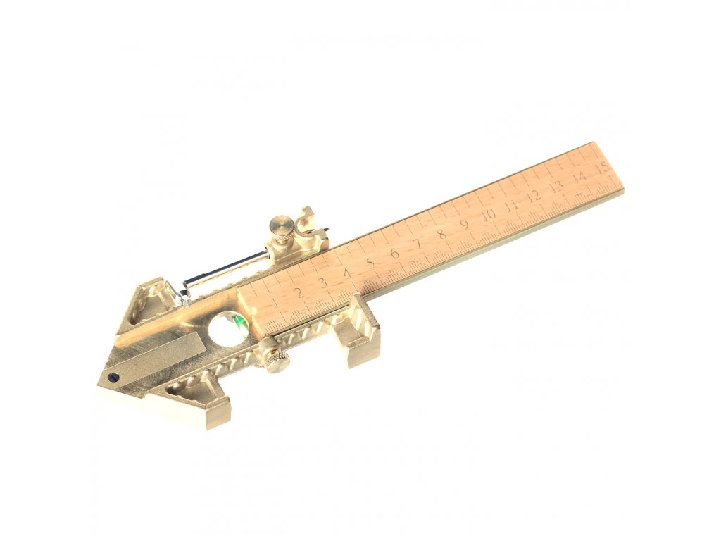 Szögmérésre, egyenletesség/simaság, mélység mérésére és pontozásra/rajzolásra alkalmas vonalzó. Az eszköztest sárgarézből, a vonalzó fából készült. Hossz: 152 mm.