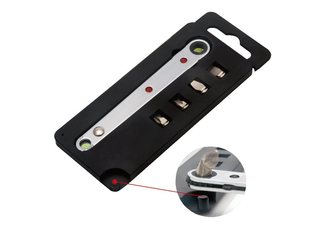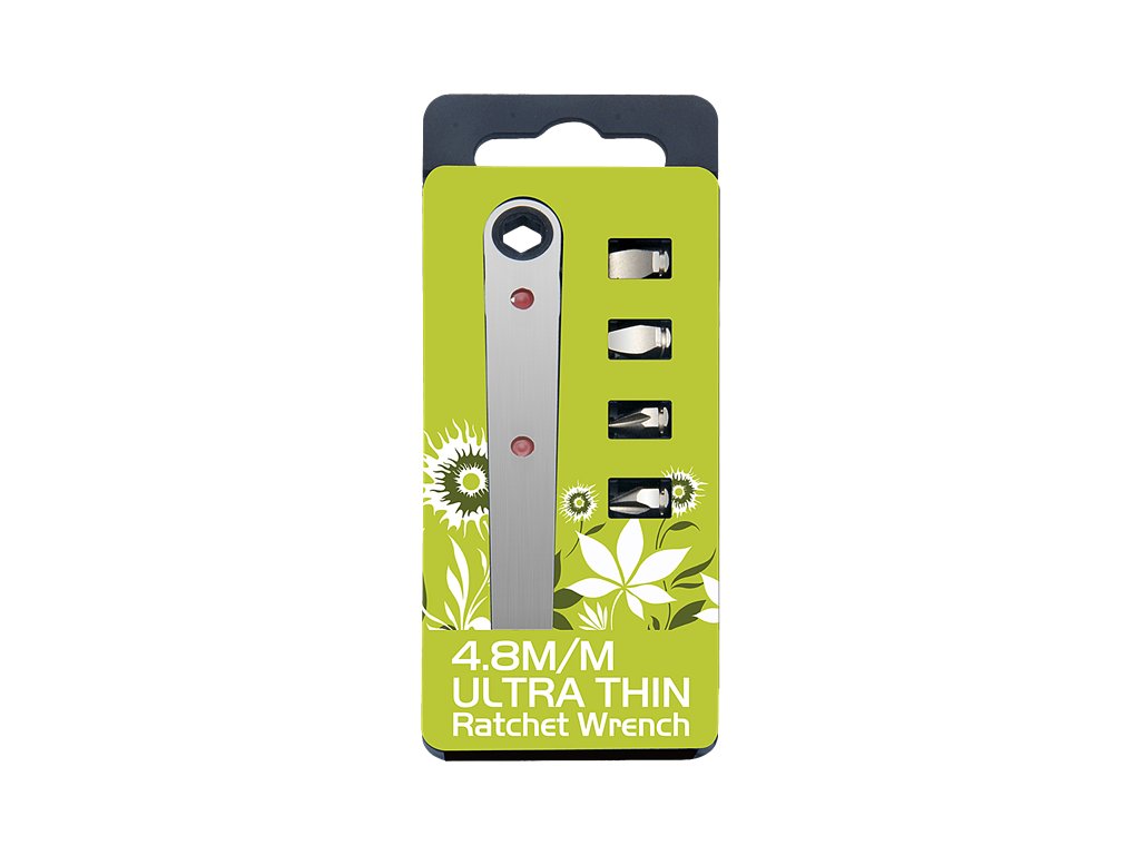 Ezt az ultravékony racsnis kulcsot ott is használhatja, ahová hagyományos csavarhúzóval nem fér hozzá. A kulcs vastagsága csak 4,8 mm, a forgatónyomatéka 11,75 Nm, átkapcsolható jobbos/balos hajtás, 20 fog a keréken. A készletbe egy ultravékony kulcs, bitek (PH1, PH2, lapos: 3, 5) és egy műanyag bitkinyomó tartozik.