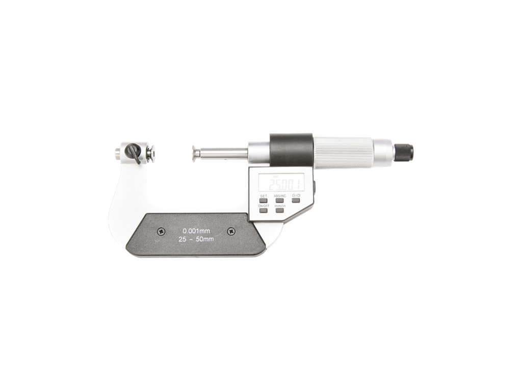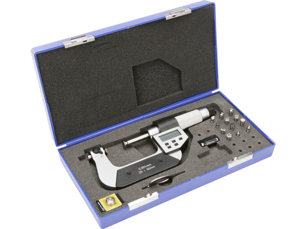 Mérési tartomány 25 - 50 mm között, pontosság 0,001 mm. A mikrométerrel mm-ben, vagy hüvelykben is mérhetők a méretek. A mikrométer előnye, hogy 7 különböző betét segítségével egy mérőműszerrel lehet megmérni a különböző méretfajtákat.
