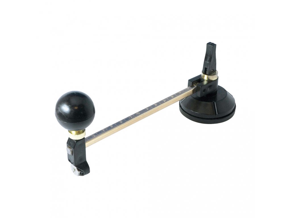 Vágófej 6 volfrámkarbid vágókerékkel. Az 55 mm-es tapadókorong pontosan tartja a vágót. Acél vágókar tiszta metrikus mérleggel. Tiszta lyukakat vág az üvegbe, egy forgó fogantyút a sima körkörös mozgás érdekében. A köröket szabványos üvegre vágja, amelynek átmérője 65 –300 mm / vastagsága 2–8 mm.