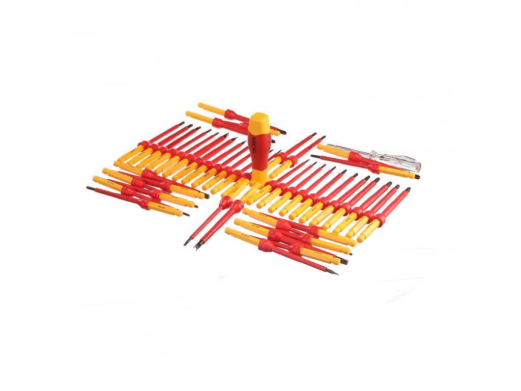 A készletben a következő csavarhúzók találhatók: 100 mm hosszú, SL2,0; 2,5; 3,0; 3,5; 4,0; 5,5 és 6,5; továbbá PH0; 1 és 2; PZ0; 1 és 2; T6; 8; 9; 10; 15; 20; 25; 27 és 30; H2,5; 3,0; 4,0; 5,0 és 6,0; R1 és 2; TRI1; 2; 3 és 4; TORO4; 6; 8 és 10; M4; 5; és 6; U100 × 4; 6; 8; 10; elosztószekrény kulcs 89 x 6,3; 8,1; 9; 14; fáziskereső 3 × 70 és 31 × 105 toldalék fogantyú. Textil táskába csomagolva.