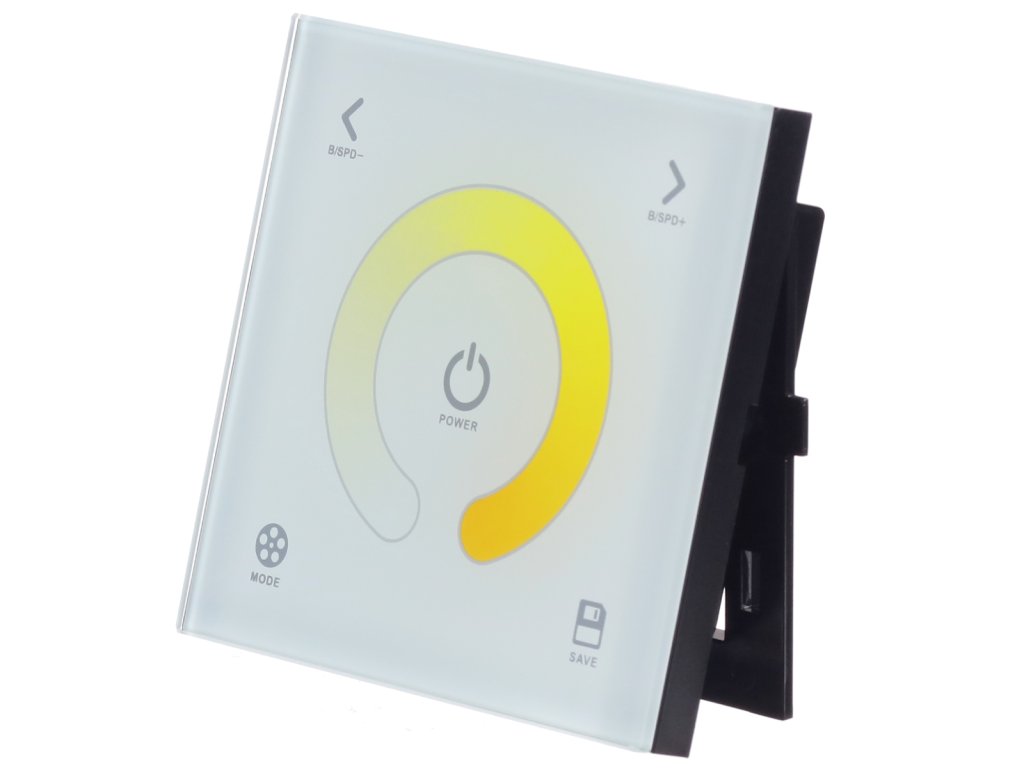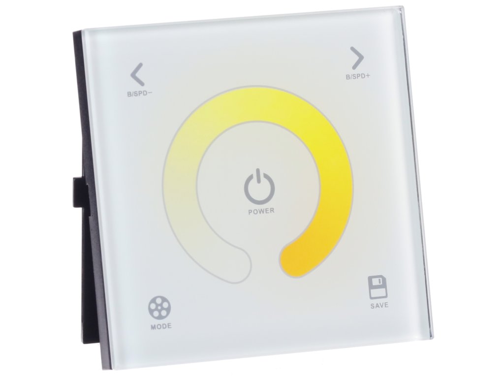 A fali beépített érintő vezérlő LED szalagok ls más lámpák irányítására is alkalmas, egy zónán belül. A kapcsolóval a fényerősség és a színhőmérséklet is állítható (a melegtől a semlegesen át a hideg fehérig) - TAS. Figyelem! A szerelődoboz nem a csomag része, hanem külön kell megvásárolni - rend. sz. PN780614. A kapcsoló önállóan, controllerrel is használható a fényforrások vezérlésére, vagy a WIFI 666-tal ellátott rendszerbe csatlakoztatható – rend.sz. PN780601 (amennyiben telefonon keresztül kívánja vezérelni a világítást).