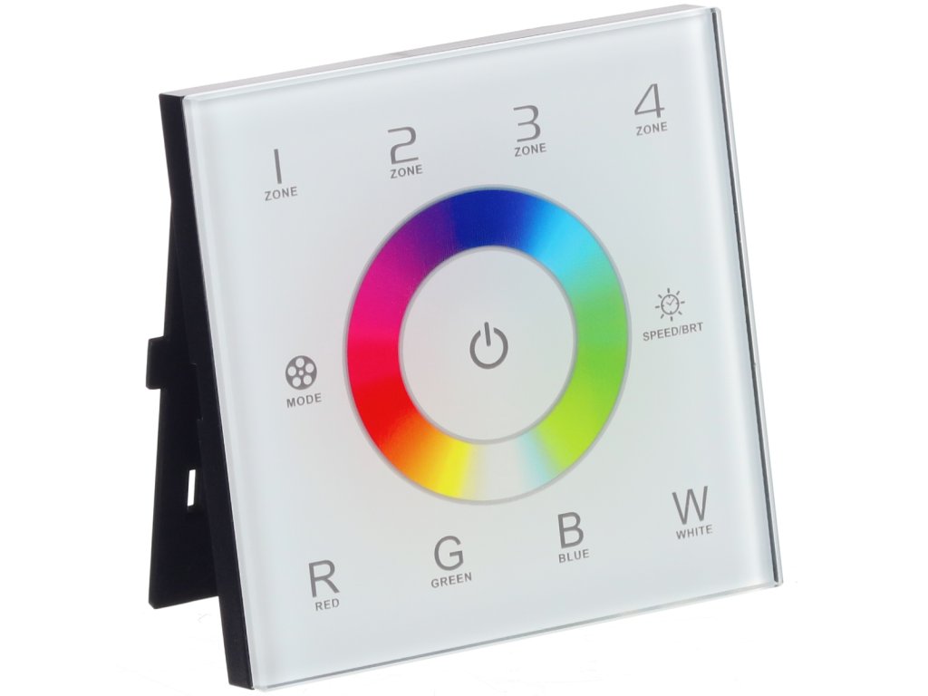 A beépített fali kapcsolóval LED szalagokat és más fényforrásokat is szabályozhat, négy zónában. A kapcsolóval a fényerősség és a fény színe is állítható az RGB és RGBW színskálán belül. Figyelem! A szerelődoboz nem a csomag része, hanem külön kell megvásárolni - rend. sz. PN780614. A kapcsoló önállóan, controllerrel is használható a fényforrások vezérlésére, vagy a WIFI 666-tal ellátott rendszerbe csatlakoztatható – rend.sz. PN780601 (amennyiben telefonon keresztül kívánja vezérelni a világítást).